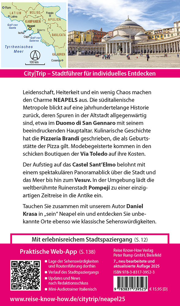 Dieser aktuelle Stadtführer ist der ideale Begleiter, um alle Seiten der süditalienischen Metropole am Fuße des Vesuvs selbstständig zu entdecken:- Die wichtigsten Sehenswürdigkeiten und Museen der Stadt sowie weniger bekannte Attraktionen und Viertel ausführlich vorgestellt und bewertet- Faszinierende Architektur zwischen unterirdischen Zisternen aus griechischer Vorzeit und beeindruckenden Klöstern und Burgen- Abwechslungsreicher Stadtspaziergang- Erlebnisvorschläge für einen Kurztrip- Ausflüge nach Pompeji, Capri und zum Vesuv- Shoppingtipps von bunten Märkten bis zu angesagten- Die besten Lokale der Stadt und allerlei Wissenswertes über die neapolitanische Küche- Tipps für die Abend- und Nachtgestaltung: vom Theaterevent in historischer Kulisse bis zu Open-Air-Tanzflächen angesagter Klubs- Von Margherita bis Marinara: die Pizza, Kulturgut des neapolitanischen Volkes- Neapel zum Träumen und Entspannen: Orto Botanico, Villa Floridiana, Parco Vergiliano- Ausgewählte Unterkünfte von preiswert bis ausgefallen- Alle praktischen Infos zu Anreise, Preisen, Stadtverkehr, Touren, Events, Hilfe im Notfall ...- Hintergrundartikel mit Tiefgang: Geschichte, Mentalität der Bewohner, Leben in der Stadt ...- Kleine Sprachhilfe Italienisch mit den wichtigsten Vokabeln für den Reisealltag- Faltplan zum HerausnehmenDazu: kostenlose Web-App für Smartphone, Tablet und PC mit Stadtplan- und Satellitenansichten passend zum Text, Routenführung zu allen beschriebenen Sehenswürdigkeiten, Verlauf des Stadtspaziergangs, seitenbezogenen Updates nach Redaktionsschluss sowie einem Mini-Audiotrainer Italienisch.+++ CityTrip - die aktuellen Stadtführer von Reise Know-How, mit über 160 Städtezielen die weltweit umfangreichste Kollektion. Fundiert, übersichtlich, praktisch.+++ REISE KNOW-HOW - Reiseführer für individuelle Reisen