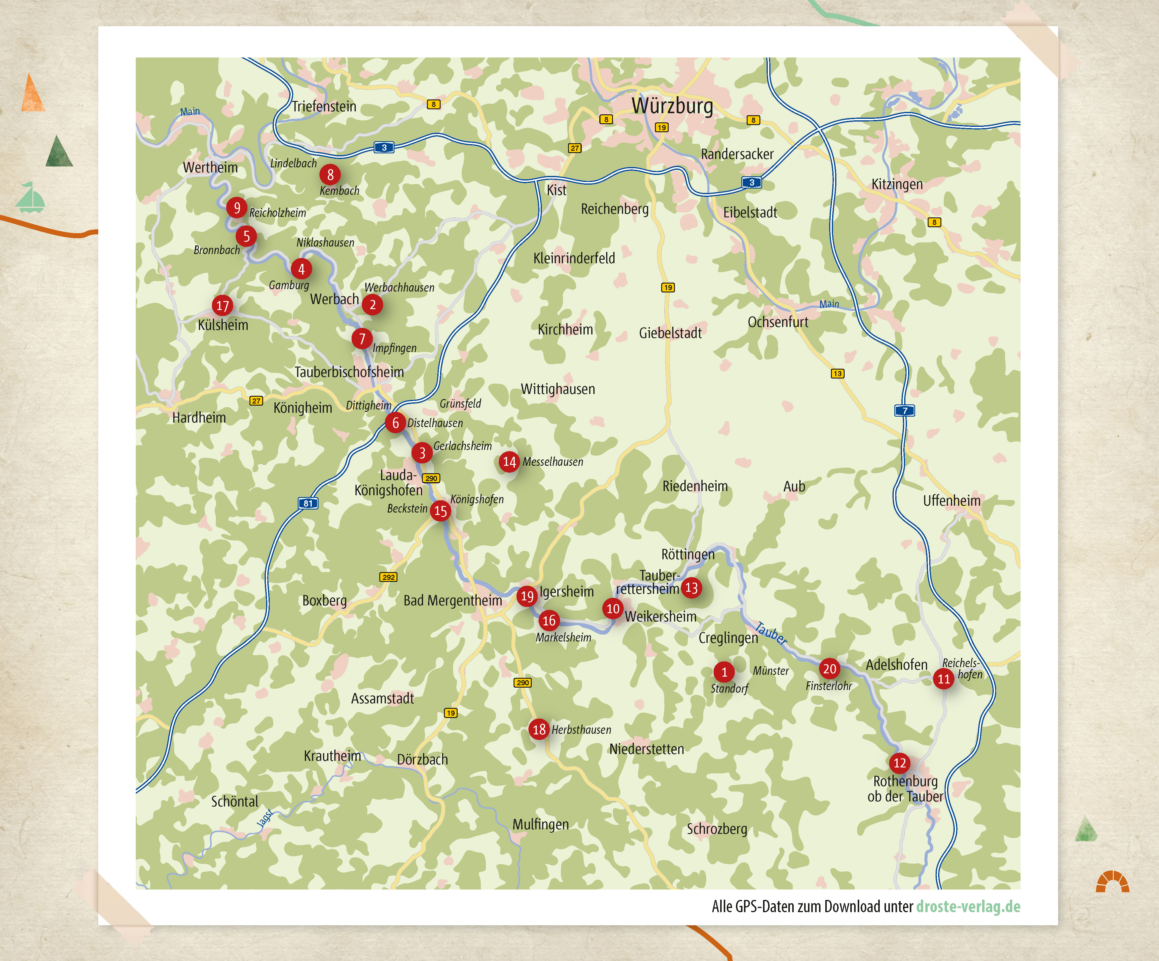 Saftige Wiesen, malerische Flusstäler, dicht bewaldete Hänge und Weinbergterrassen: Wer verliebt sich da nicht in das liebliche Taubertal? Auf romantischen Wegen geht es in pittoreske Dörfer und Städte, wo in verwinkelten Gassen neben Fachwerkhäusern historische Schlösser, Kirchen und blühende Gärten zu Ruheoasen werden. Von Rothenburg bis nach Wertheim - feine Trauben und rustikales Bier verlocken an vielen Orten zu Wohlfühlpausen. Ein Genuss für alle Sinne!