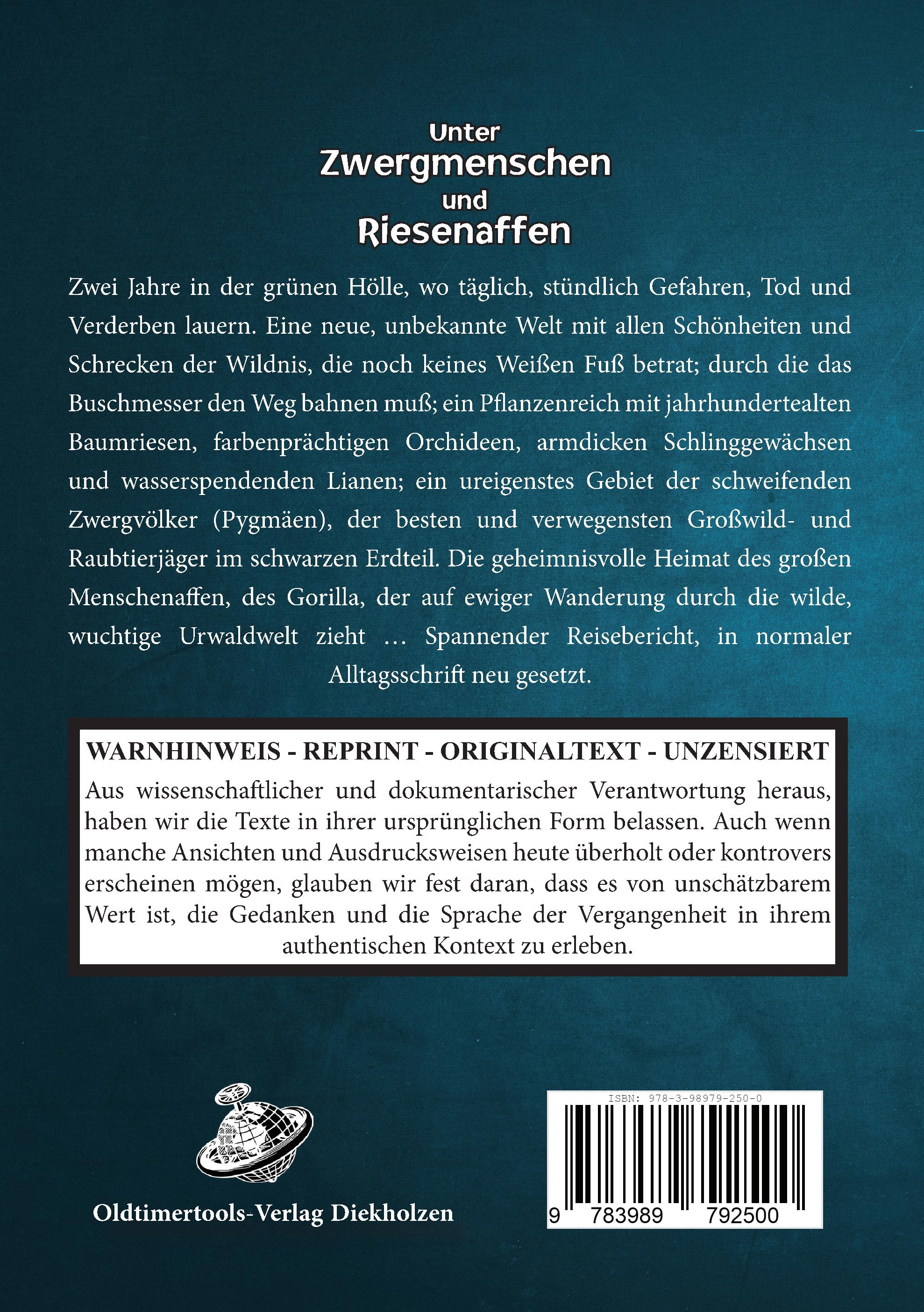 Zwei Jahre in der grünen Hölle, wo täglich, stündlich Gefahren, Tod und Verderben lauern. Eine neue, unbekannte Welt mit allen Schönheiten und Schrecken der Wildnis, die noch keines Weißen Fuß betrat; durch die das Buschmesser den Weg bahnen muß; ein Pflanzenreich mit jahrhundertealten Baumriesen, farbenprächtigen Orchideen, armdicken Schlinggewächsen und wasserspendenden Lianen; ein ureigenstes Gebiet der schweifenden Zwergvölker (Pygmäen), der besten und verwegensten Großwild- und Raubtierjäger im schwarzen Erdteil. Die geheimnisvolle Heimat des großen Menschenaffen, des Gorilla, der auf ewiger Wanderung durch die wilde, wuchtige Urwaldwelt zieht ... Spannender Reisebericht, in normaler Alltagsschrift neu gesetzt.