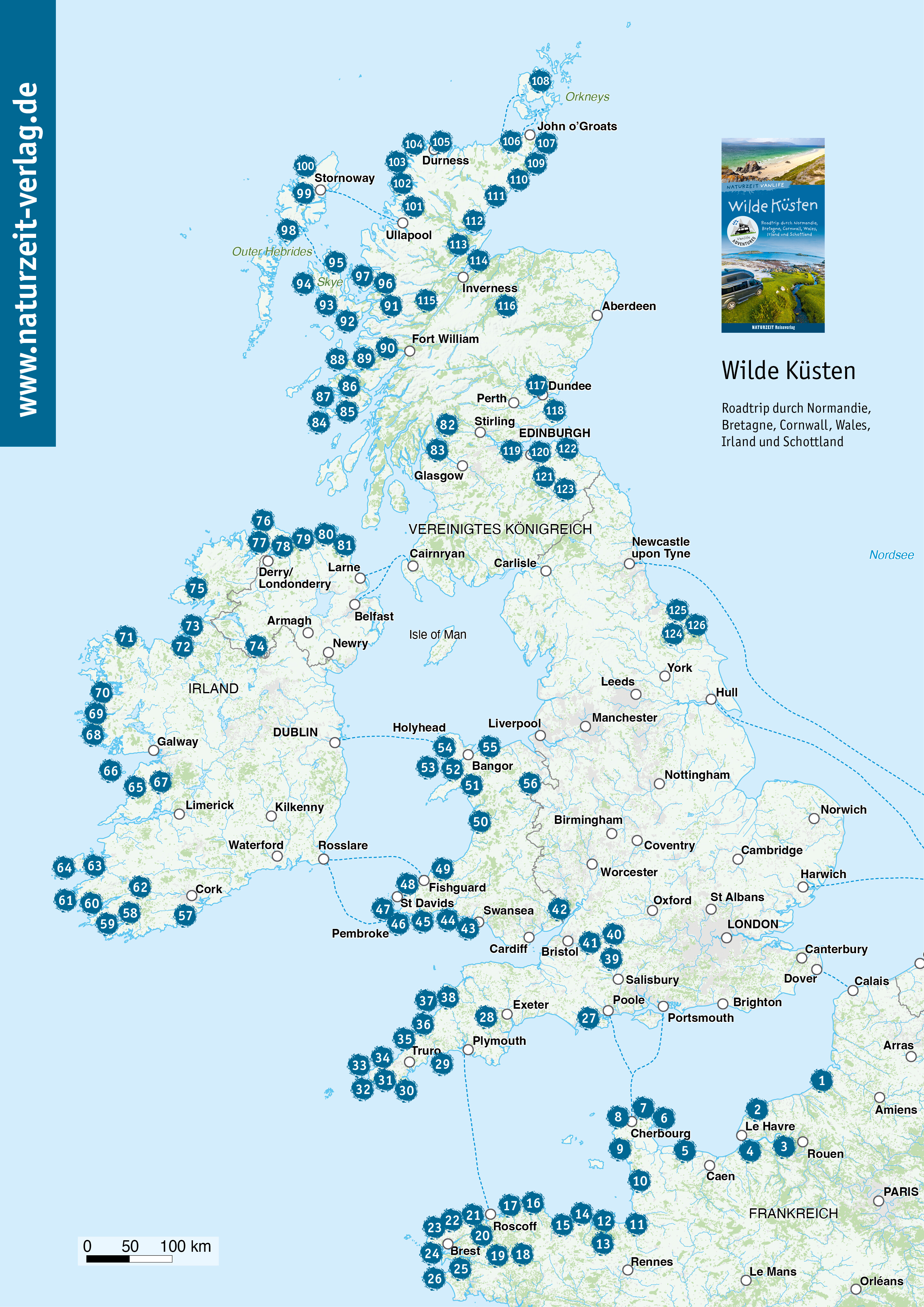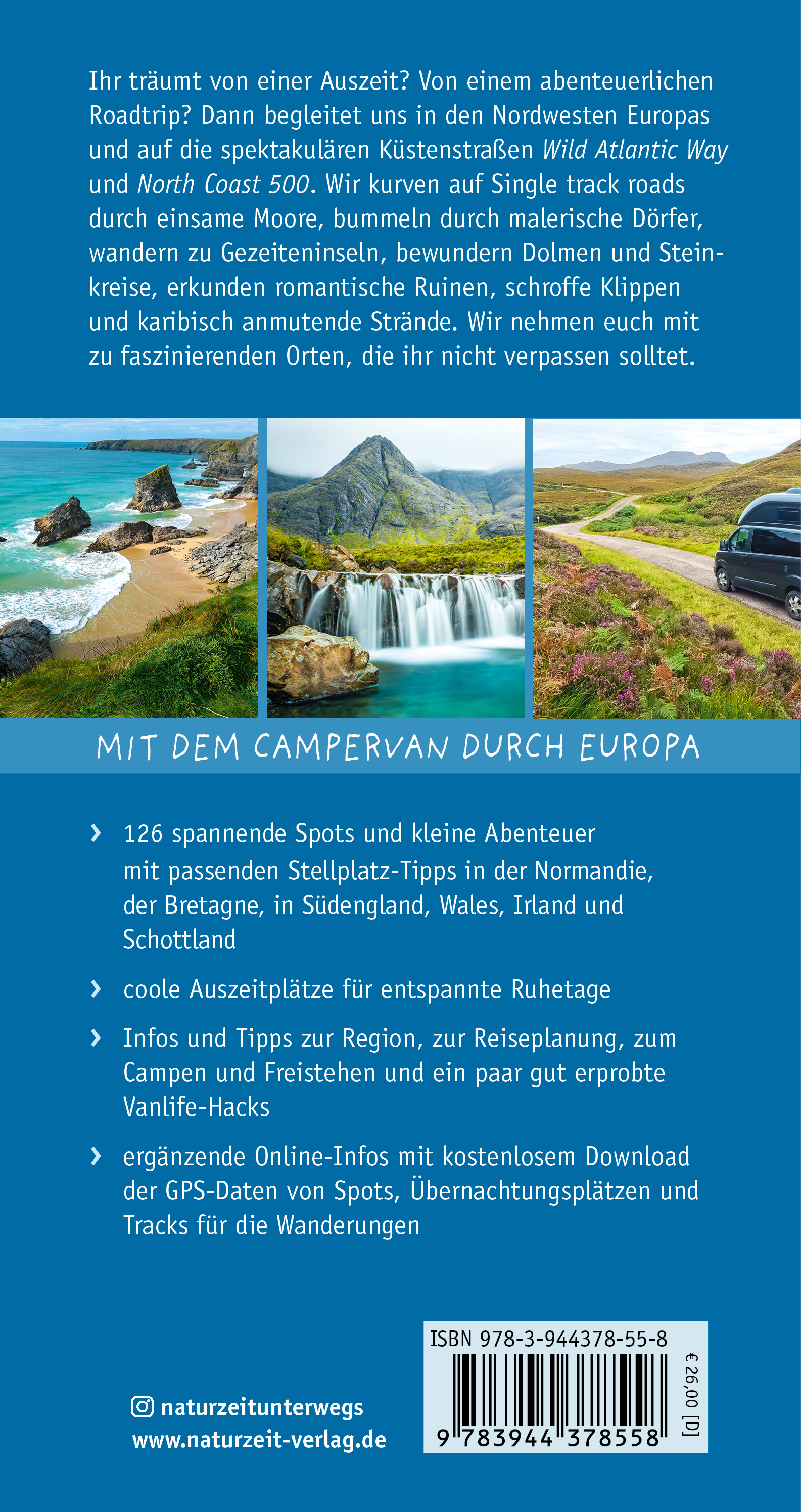 Ihr träumt von einer Auszeit? Von einem abenteuerlichen Roadtrip? Dann begleitet uns in den Nordwesten Europas und auf die spektakulären Küstenstraßen Wild Atlantik Way und North Coast 500. Wir kurven auf Single Track Roads durch einsame Moore, bummeln durch malerische Dörfer, wandern zu Gezeiteninseln, bewundern Dolmen und Steinkreise, erkunden romantische Ruinen, schroffe Klippen und karibisch anmutende Strände. Wir nehmen euch mit zu faszinierenden Orten, die ihr nicht verpassen solltet. - 125 spannende Spots und kleine Abenteuer mit passenden Stellplatz-Tipps in der Normandie, der Bretagne, in Südengland, Wales, Irland und Schottland - coole Auszeitplätze für entspannte Ruhetage - Infos und Tipps zur Region, zur Reiseplanung, zum Campen und Freistehen und ein paar gut erprobte Vanlife-Hacks - ergänzende Online-Infos mit kostenlosem Download der GPS-Daten von Spots, Übernachtungsplätzen und Tracks für Wanderungen