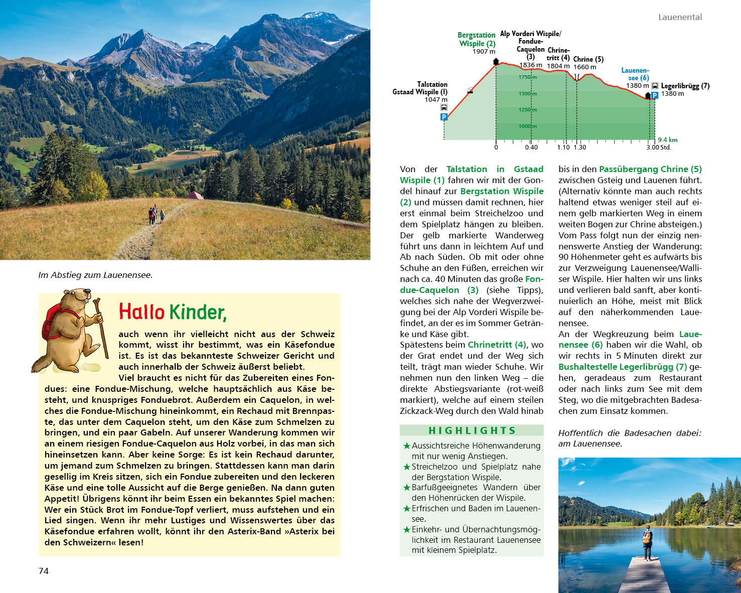 Auf jeder Wanderung warten viele Highlights auf die Kids: spannende Erlebniswege, rasante Abfahrten mit der Sommerrodelbahn, Klettern in Seilgärten, Toben auf tollen Abenteuerspielplätzen und lustige Fahrten mit dem »Trotti-Bike« (der Schweizer Roller Version). Und wenn die Füße mal eine Pause brauchen, bietet das Buch zusätzlich noch über 40 spannende Freizeit- und Schlechtwettertipps vor.