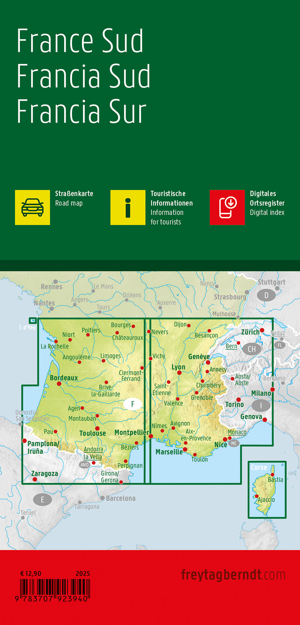 Die Straßenkarte Frankreich Süd im Maßstab 1:500.000 enthält alle wichtigen Informationen für Urlauber die Südfrankreich mit Auto, Motorrad oder Wohnwagen besuchen möchten. Das umfassende Straßennetz ist präzise dargestellt, Touristenstraßen sind farblich markiert und viele touristische Attraktionen sind auf der Karte verzeichnet.