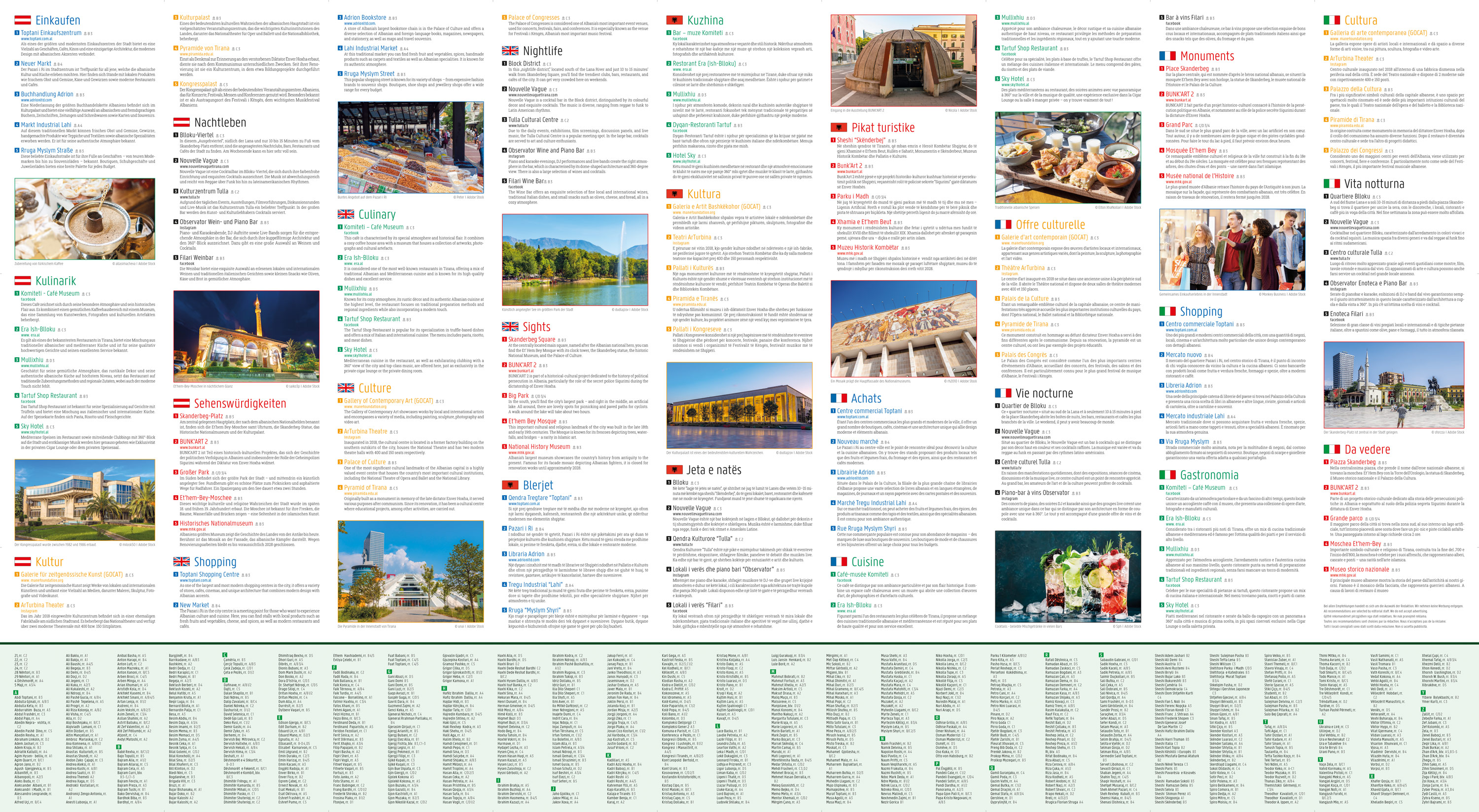 Der City Pocket Stadtplan "Tirana 1:10.000" zeigt die Innenstadt von Tirana und bietet auf der Rückseite zahlreiche Zusatzinformationen und unsere Top Empfehlungen zu den Themen: Einkaufen, Kulinarik, Kultur, Nachtleben und Sehenswürdigkeiten.