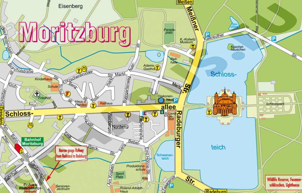 Mit Zwinger, Frauenkirche, Schloss, Museen, öffentliche Verkehrsmittel, Hotels, Fußwegen, Informationen zur Stadt; Karte von Moritzburg und Pillnitz.