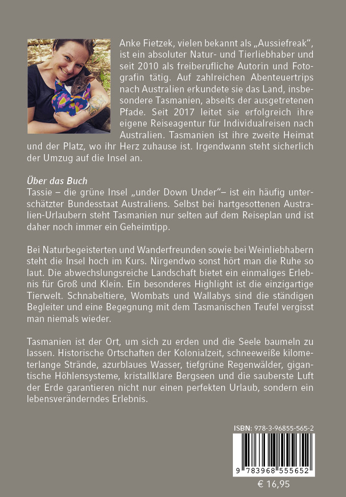 Anke Fietzek, vielen bekannt als „Aussiefreak“, ist ein absoluter Natur- und Tierliebhaber und seit 2010 als freiberufliche Autorin und Fotografin tätig. Auf zahlreichen Abenteuertrips nach Australien erkundete sie das Land, insbesondere Tasmanien, abseits der ausgetretenen Pfade. Seit 2017 leitet sie erfolgreich ihre eigene Reiseagentur für Individualreisen nach Australien. Tasmanien ist ihre zweite Heimat und der Platz, wo ihr Herz zuhause ist. Irgendwann steht sicherlich der Umzug auf die Insel an.