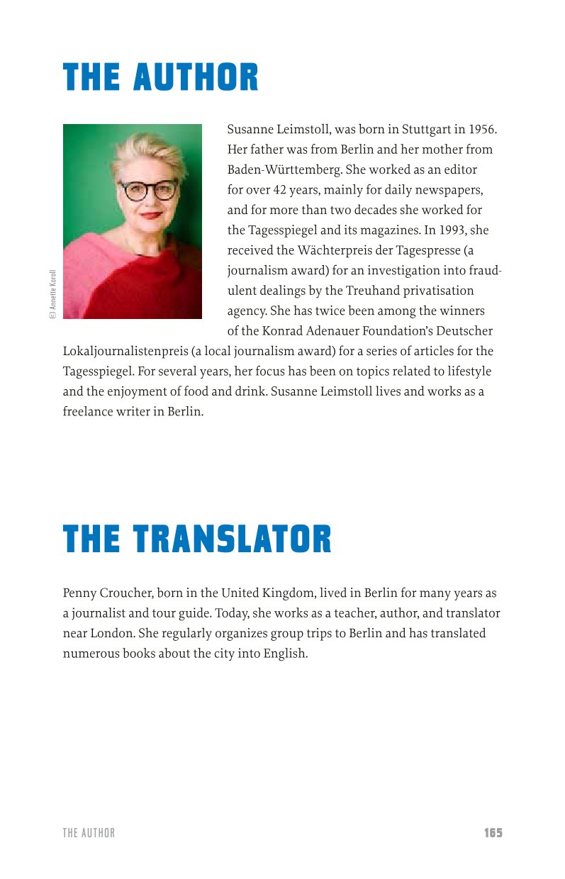 Susanne Leimstoll, geboren 1956, war Redakteurin für verschiedene Tageszeitungen, seit mehr als zwei Jahrzehnten und noch immer für den Tagesspiegel und dessen Magazine. 1993 erhielt sie den Wächterpreis der Tagespresse, zweimal war sie unter den Preisträgern des Deutschen Lokaljournalistenpreises der Konrad-Adenauer-Stiftung. Seit einigen Jahren liegt ihr Schwerpunkt auf Lifestyle- und Genuss-Themen. Susanne Leimstoll lebt und arbeitet als freie Journalistin in Berlin.