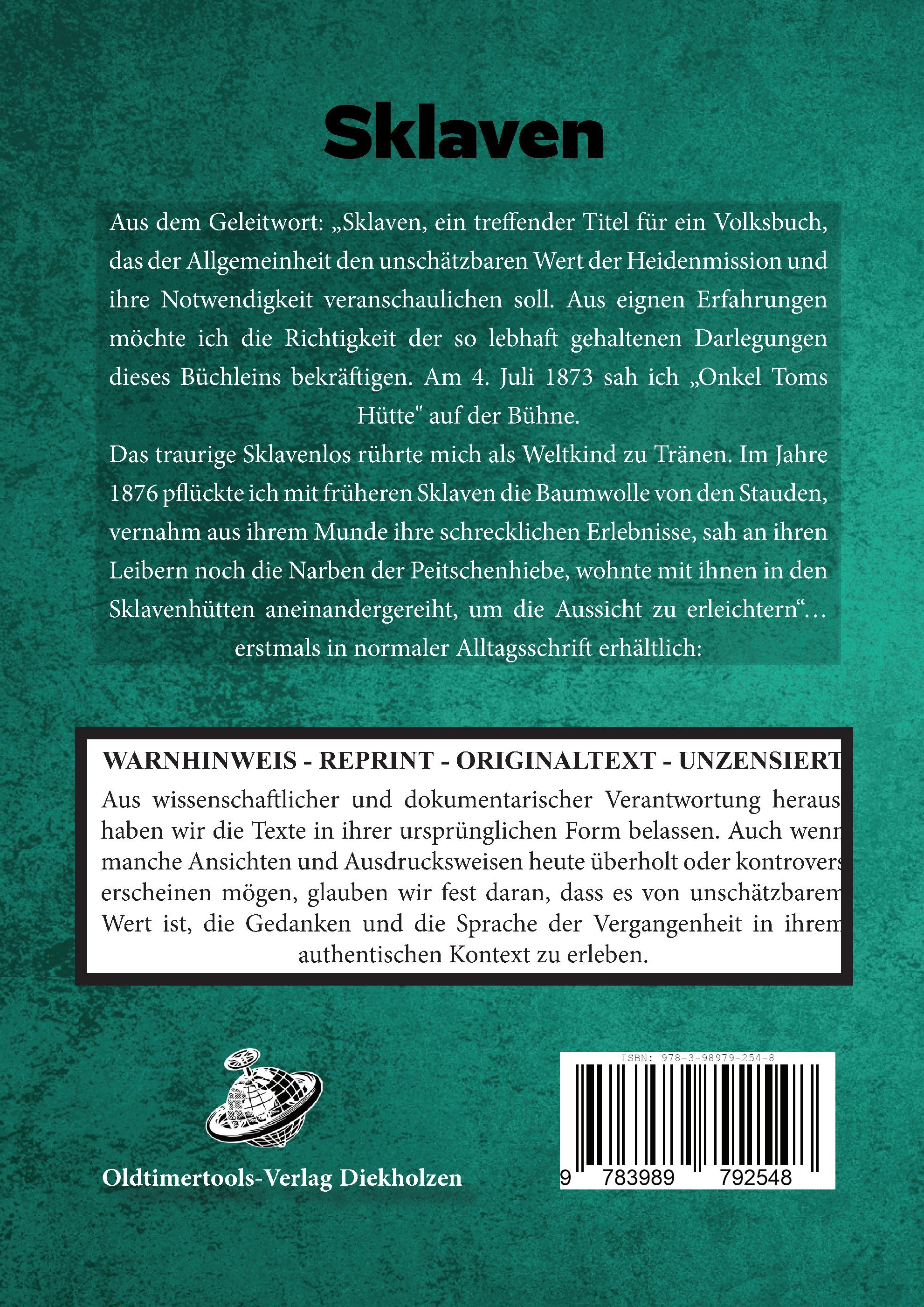 Aus dem Geleitwort: "Sklaven, ein treffender Titel für ein Volksbuch, das der Allgemeinheit den unschätzbaren Wert der Heidenmission und ihre Notwendigkeit veranschaulichen soll. Aus eignen Erfahrungen möchte ich die Richtigkeit der so lebhaft gehaltenen Darlegungen dieses Büchleins bekräftigen. Am 4. Juli 1873 sah ich "Onkel Toms Hütte" auf der Bühne.Das traurige Sklavenlos rührte mich als Weltkind zu Tränen. Im Jahre 1876 pflückte ich mit früheren Sklaven die Baumwolle von den Stauden, vernahm aus ihrem Munde ihre schrecklichen Erlebnisse, sah an ihren Leibern noch die Narben der Peitschenhiebe, wohnte mit ihnen in den Sklavenhütten aneinandergereiht, um die Aussicht zu erleichtern"... erstmals in normaler Alltagsschrift erhältlich: