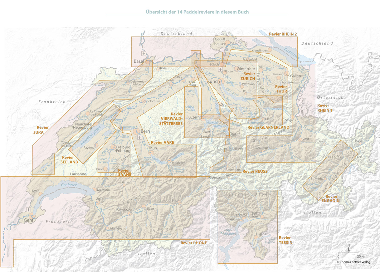 Aare, Engadin, Glarnerland, Jura, Reuss, Rhein 1 & 2, Rhone, Saane, Seeland, Tessin, Thur, Vierwaldstättersee, Zürich