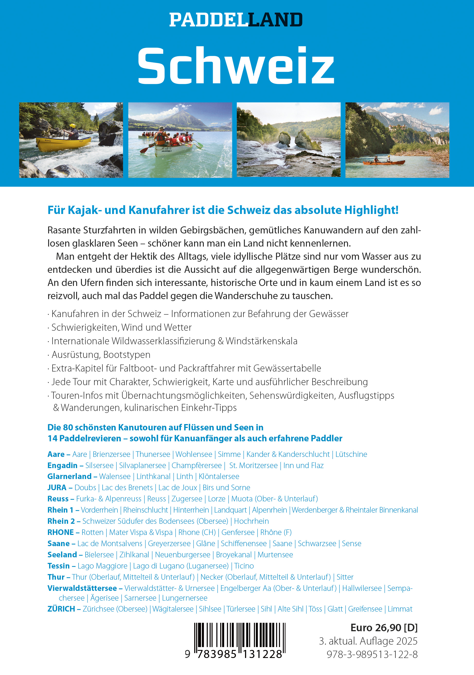 Kanufahren in der Schweiz – Informationen zur Befahrung der Gewässer, Schwierigkeit Wind und Wetter, Internationale Wildwasserklassifizierung & Windstärkenskala in Beaufort, Ausrüstung, Bootstypen, Extra Kapitel für Faltboot- und Packraftfahrer mit Gewässertabelle, Jede Tour mit Charakter, Schwierigkeit, Karte und ausführlicher Beschreibung, Touren-Infos mit Übernachtungsmöglichkeiten, Sehenswürdigkeiten, Ausflugstipps