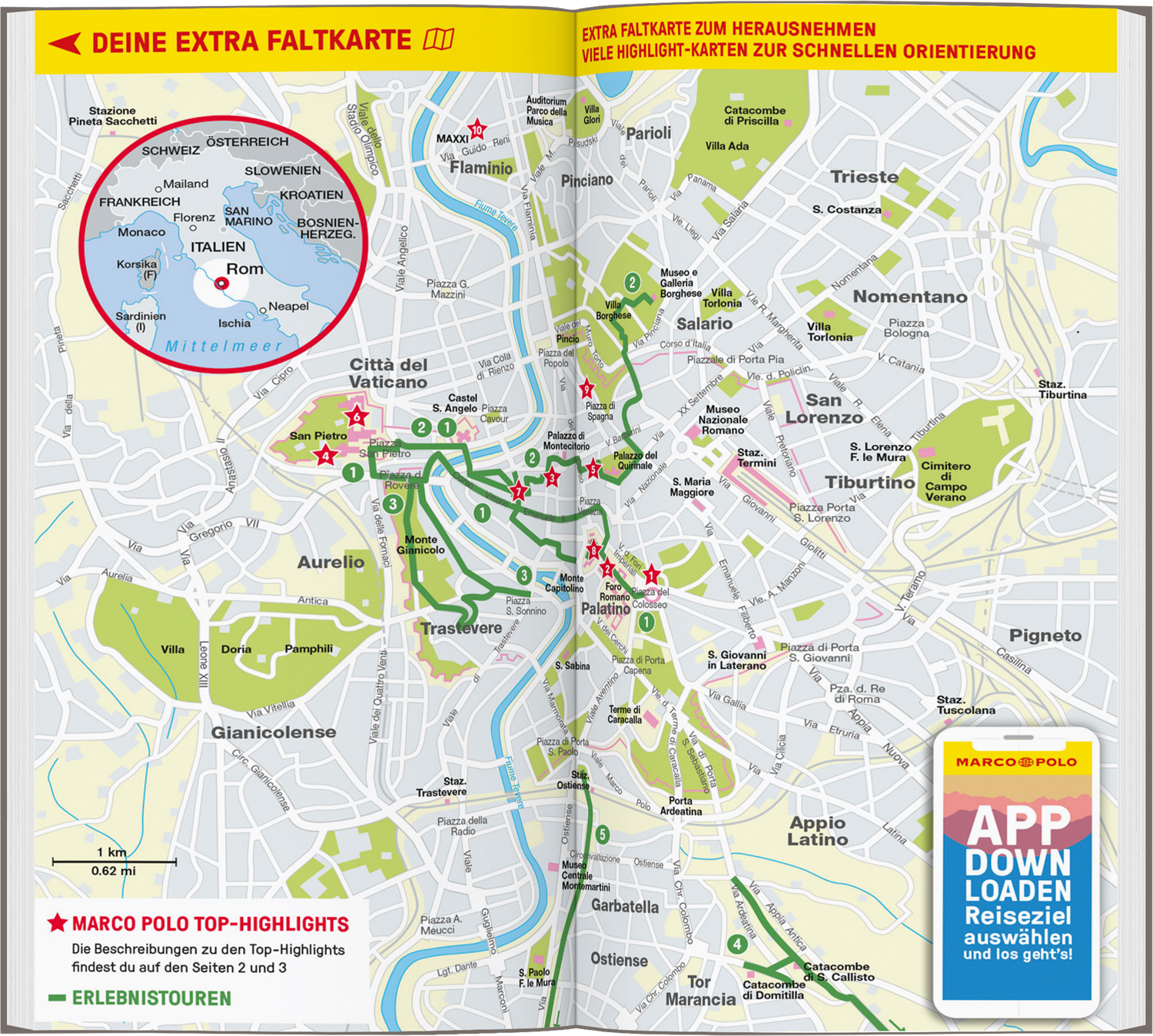 Schon vor deinem Städtetrip findest du im MARCO POLO Reiseführer Rom hilfreiche Infos zur Anreise, zu Hotels und Übernachtungsmöglichkeiten. Vor Ort stellst du dir mit dem Metroplan, den Stadtteilkarten und den Rundgängen auf Karte oder App deine eigenen Touren durch Rom zusammen: Wandle auf den Spuren des alten Roms zum Kolosseum, genieße Pracht und Prunk auf der Piazza Navona und besuche den Staat in der Stadt, den Vatikan mit Petersdom und Sixtinischer Kapelle.