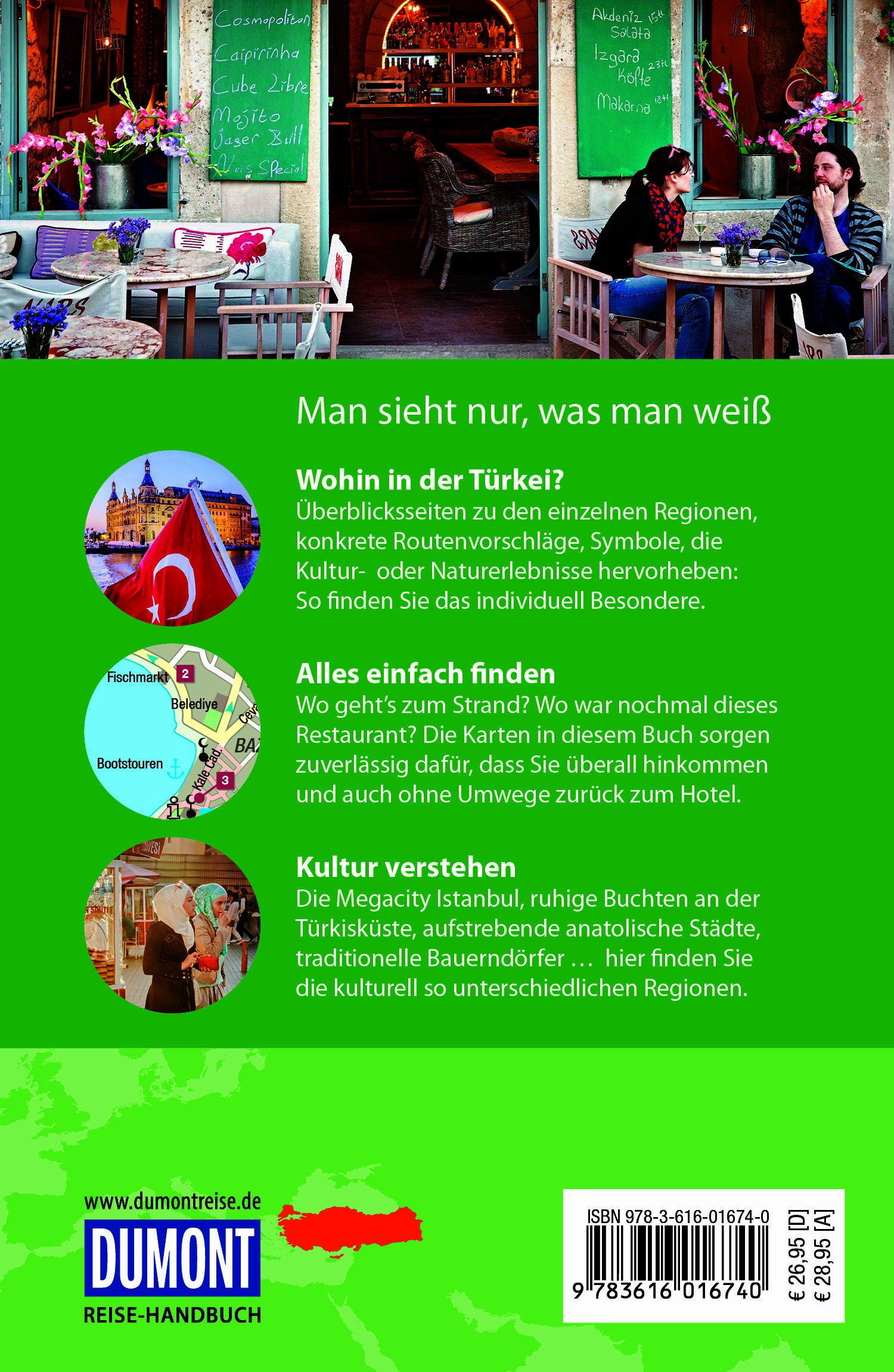 Sonnenreiche Mittelmeerküsten mit kilometerlangen Badestränden, fast unberührte Naturlandschaften im Hinterland und mit Istanbul eine der faszinierendsten Metropolen, die zwei Kontinente verbindet: Europa und Asien. Gute Gründe für eine Reise in die Türkei muss man nicht lange suchen. Für Kulturinteressierte kommen zahlreiche antike Stätten wie Troia, Ephesos oder Pergamon hinzu. Mit dem DUMONT Reise-Handbuch finden Sie die sehenswertesten Ausflugsziele auch abseits der Touristenpfade und erleben die Vielfalt der türkischen Kultur hautnah.