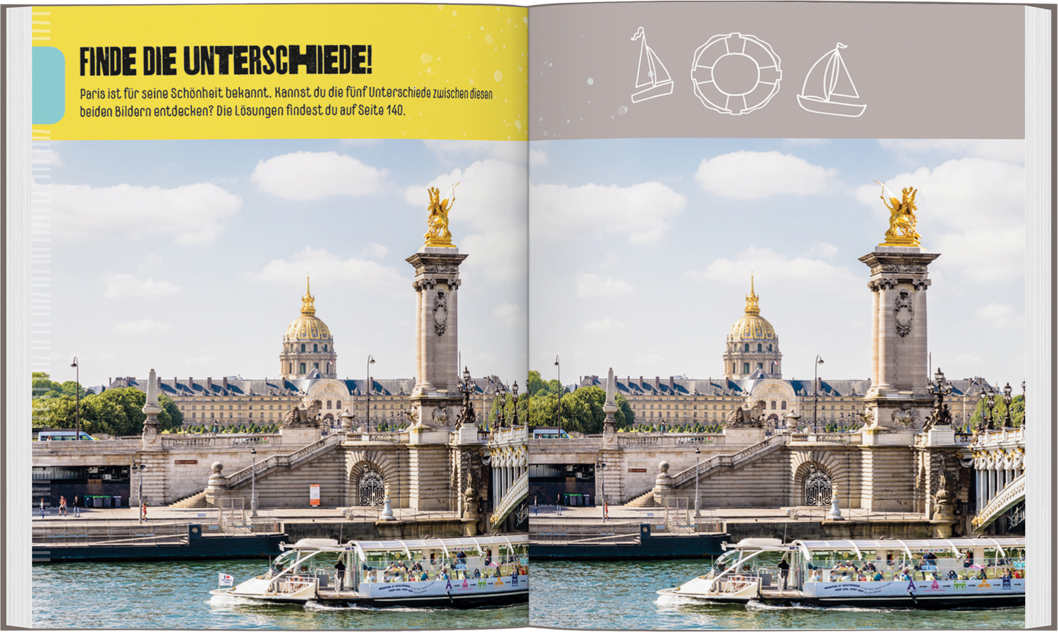 Das kinderleichte Layout führt mit kurzen Texten und Kästen sowie vielen lustigen Bildern und Illustrationen in die Destination ein.