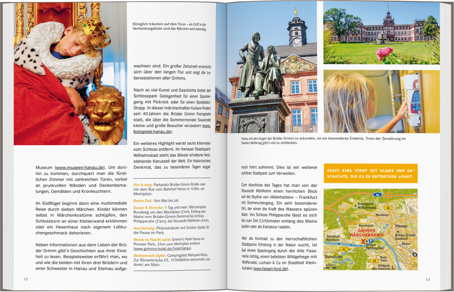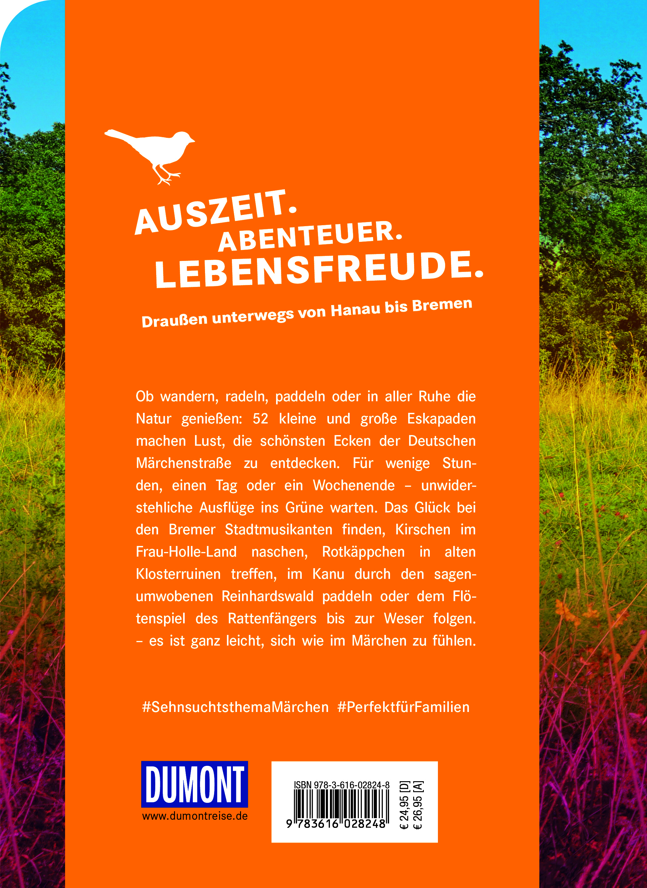 Ob wandern, radeln, paddeln oder in aller Ruhe die Natur genießen: 52 kleine und große Eskapaden machen Lust, die schönsten Ecken der Deutschen Märchenstraße zu entdecken. Für wenige Stunden, einen Tag oder ein Wochenende - unwiderstehliche Ausflüge ins Grüne warten. Das Glück bei den Bremer Stadtmusikanten finden, Kirschen im Frau-Holle-Land naschen, Rotkäppchen in alten Klosterruinen treffen, im Kanu durch den sagenumwobenen Reinhardswald paddeln oder dem Flötenspiel des Rattenfängers bis zur Weser folgen. Durch abgelegene Dörfer, heimelige Fachwerkstädtchen und verzauberte Wälder, vorbei an unzähligen Märchenbrunnen, glänzenden Schlössern und sagenumwobenen Burgen - es ist ganz leicht, sich wie im Märchen zu fühlen.