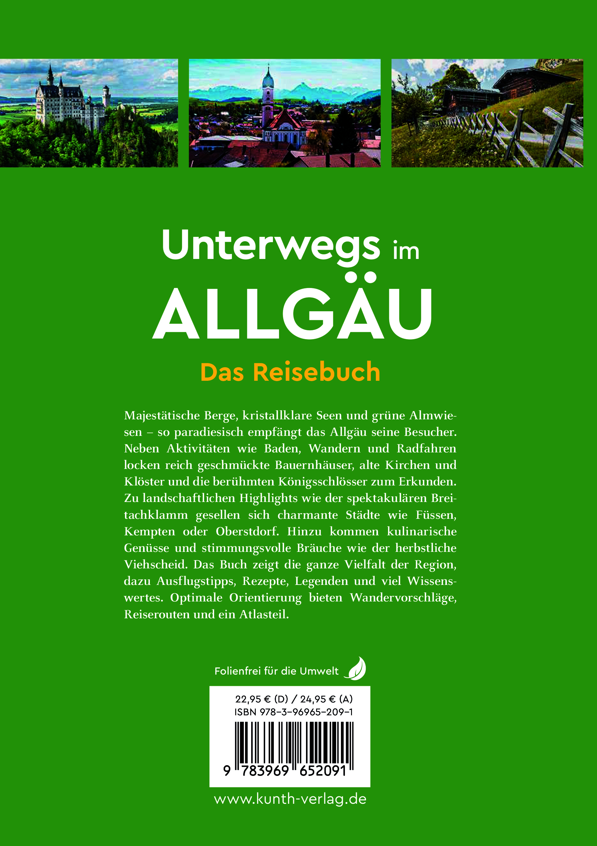 Tradition und Natur pur erleben die Reisenden in einer der malerischsten Regionen Deutschlands, bekannt für ihre majestätischen Berggipfel, sattgrünen, sanft hügeligen Wiesen und idyllischen Seen. Das KUNTH-Reisebuch "Unterwegs im Allgäu" erkundet die vielfältige Natur, traditionelle Almhütten und kulturelle Highlights wie das berühmte Märchenschloss Neuschwanstein von König Ludwig II. Diese gelungene Mischung aus vielfältigen Naturlandschaften und dem kulturellem Erbe macht das Allgäu zu einer der beliebtesten Urlaubsgebiete Deutschlands.