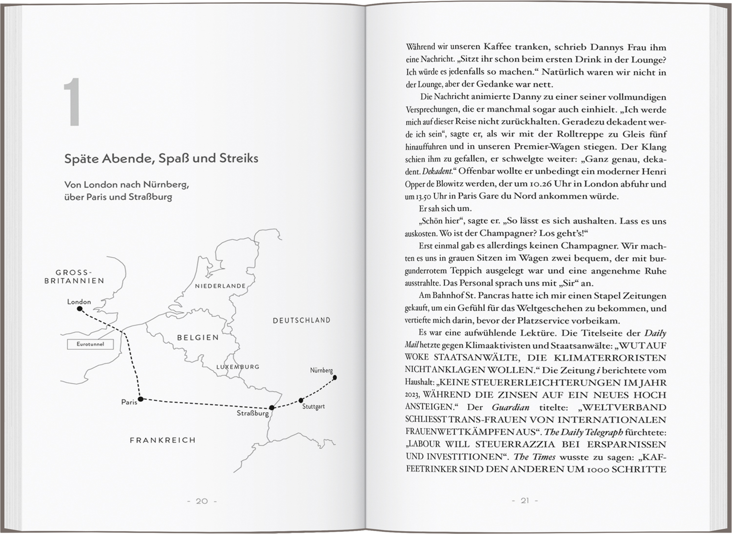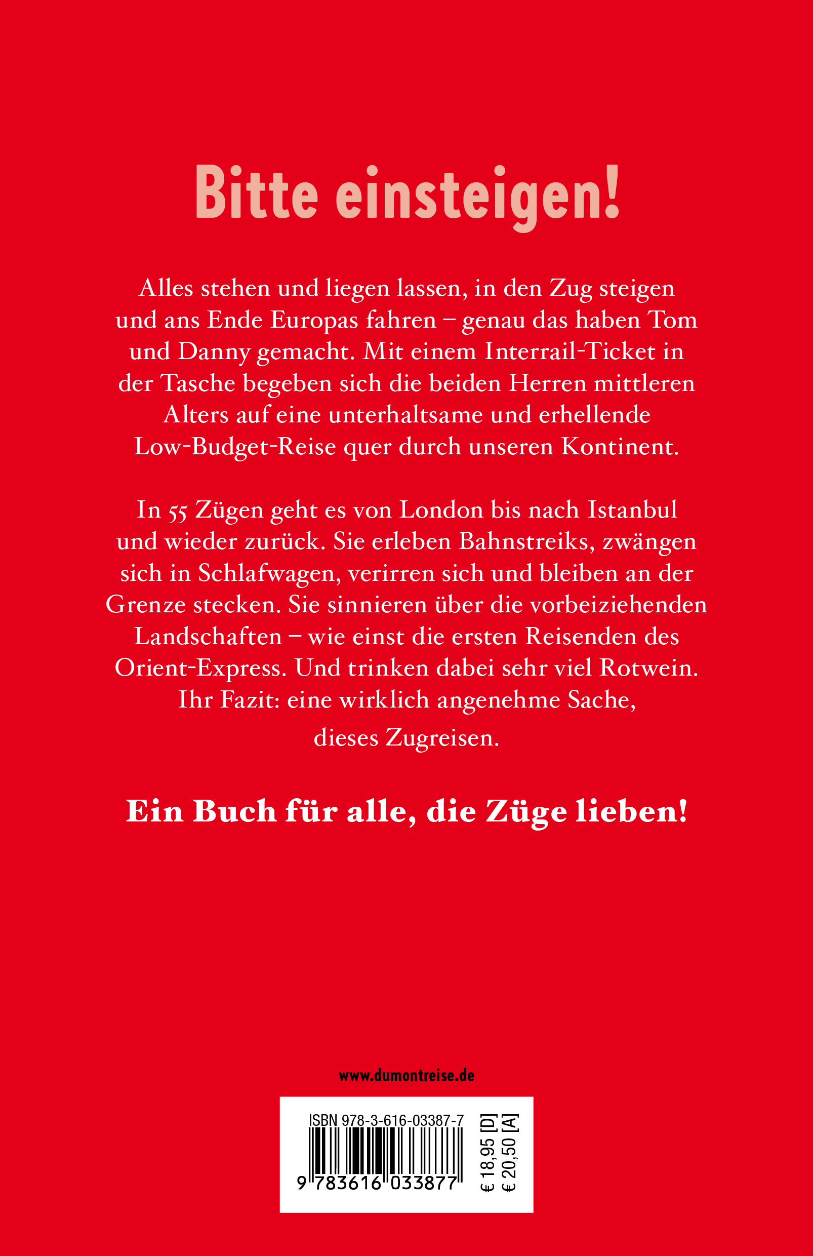 ALLES STEHEN UND LIEGEN LASSEN, in den Zug steigen und ans Ende Europas fahren - genau das haben Tom und Danny gemacht. Mit einem Interrail-Ticket in der Tasche begeben sich die beiden Herren mittleren Alters auf eine unterhaltsame und erhellende Low-Budget-Reise quer durch unseren Kontinent. In 55 Zügen geht es von London über Paris, Nürnberg, die Schweizer Alpen, Budapest und Athen bis in die entlegensten Winkel Osteuropas nach Istanbul und wieder zurück. Sie erleben Bahnstreiks, zwängen sich in Schlafwagen, verirren sich und bleiben an der Grenze stecken. Sie sinnieren über die vorbeiziehenden Landschaften - wie einst die ersten Reisenden des Orient-Express. Und trinken dabei sehr viel Rotwein. Ihr Fazit: Eine wirklich angenehme Sache, dieses Zugreisen.