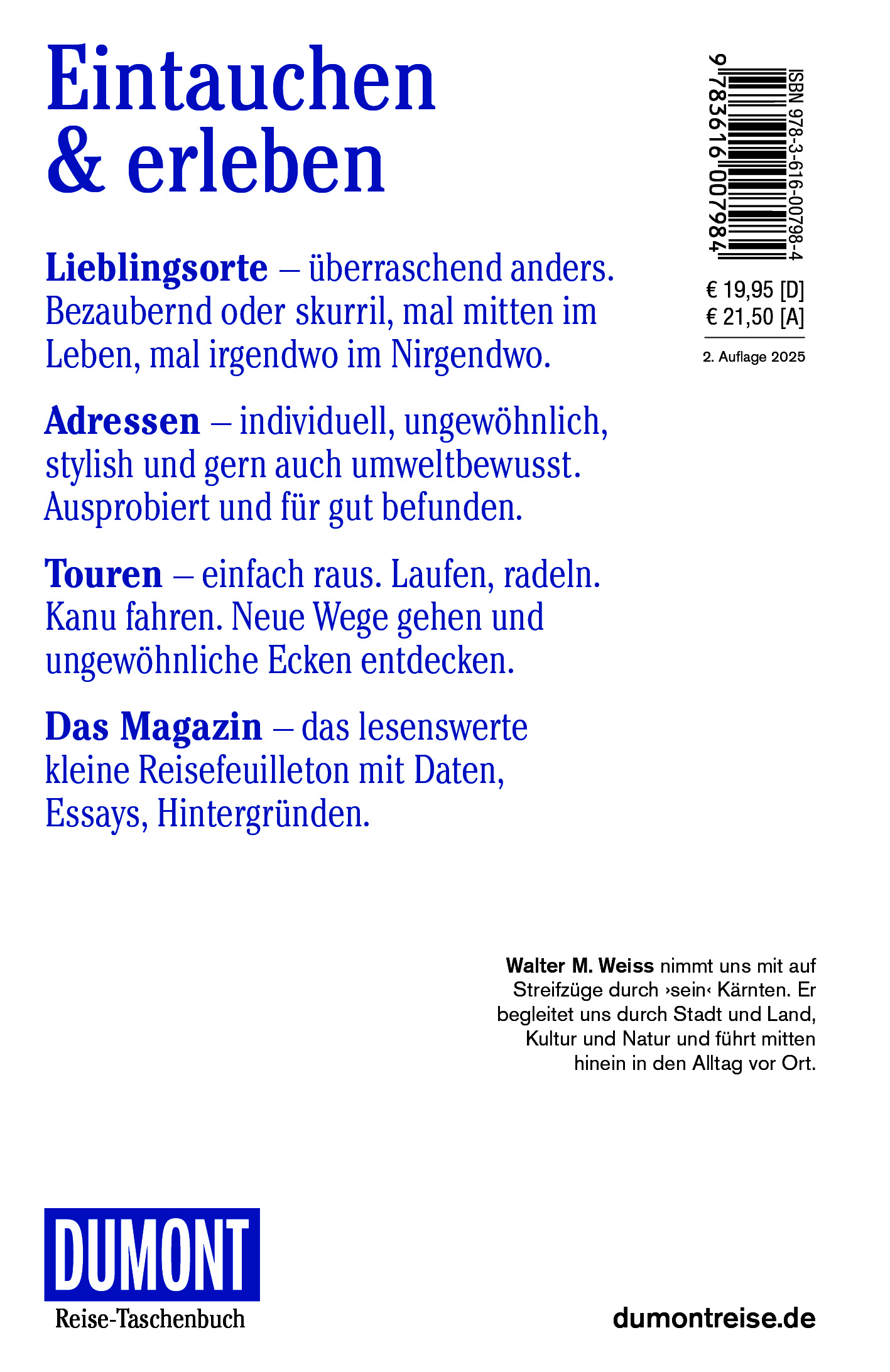Walter M. Weiss, der im nicht weit entfernten Wien lebt, kennt Österreichs südlichstes Bundesland von unzähligen Aufenthalten wie seine Westentasche. In den schon mehr als 35 Jahren seiner Tätigkeit als freier Autor hat er sehr viel über Kärnten geschrieben. Insgesamt veröffentlichte er bislang mehr als 100 Reise- und Sachbücher - im DuMont Reiseverlag u. a. über Wien, Niederösterreich, Salzburg, Venedig, Prag, Syrien und Iran. Details unter: www.wmweiss.com.