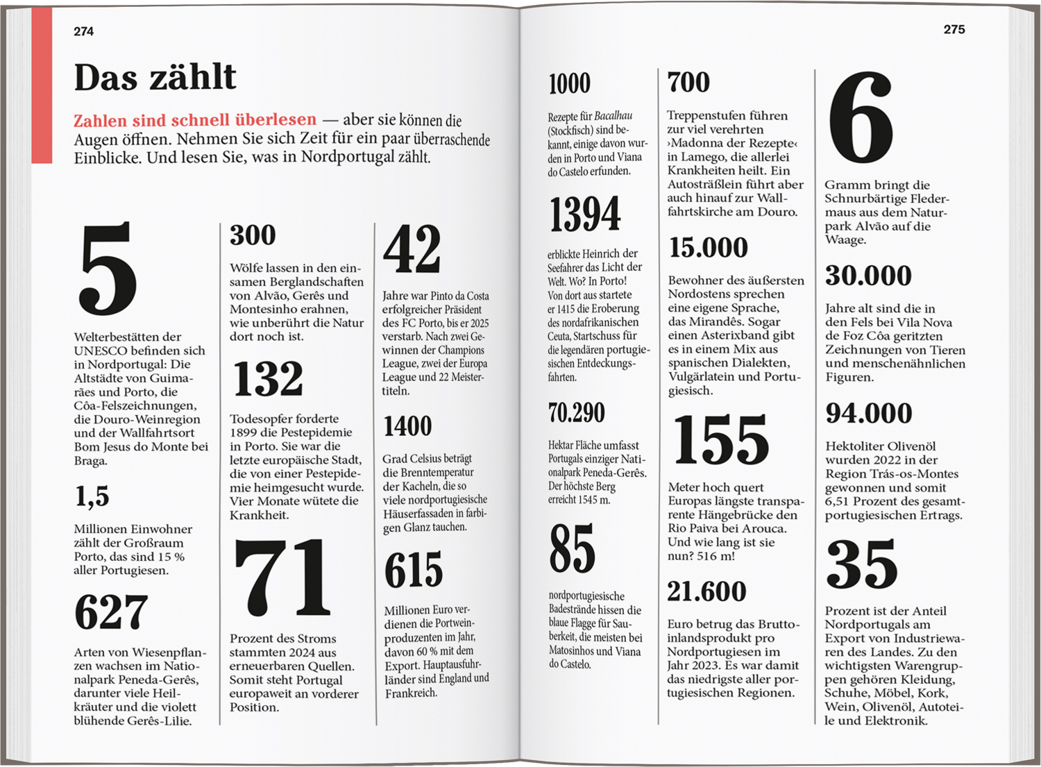Senkrechtstarter, Überflieger, Querfeldein. Vor Ort - die Kapitel: Porto, Rund um Porto, Braga, Guimarães und Barcelos, Am nördlichen Atlantik, Vom Rio Minho zum Rio Lima, Nationalpark Peneda-Gerês, Trás-os-Montes, Im Tal des Douro. Das Kleingedruckte (Reiseinfos von A bis Z). Das Magazin. Offene Fragen.