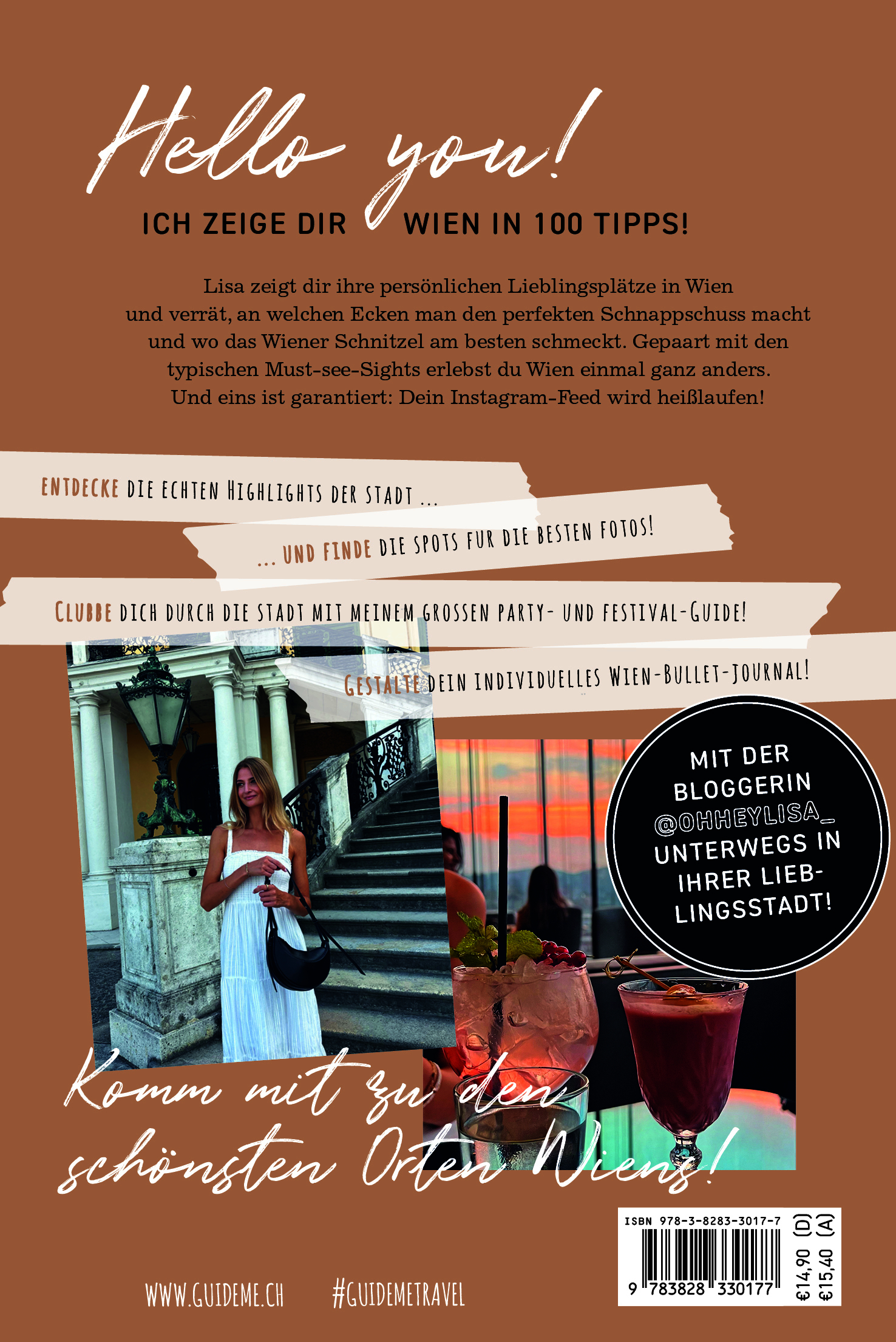 Der Reiseführer einer neuen Generation mit 100 kompakten Tipps. Die Travel-Bloggerin Lisa Bögelein zeigt dir ihre Lieblingsstadt Wien, und verrät an welcher Ecke man den perfekten Schnappschuss macht oder wo die Açai Bowl am besten schmeckt! Gepaart mit den typischen Must-See-Sights erlebst du Wien mit diesem Reiseführer einmal ganz anders. Und eins ist garantiert: Dein Instagram-Feed wird heißlaufen! Im modernen Design, mit individuellen Illustrationen und freien Kreativ-Seiten ist der GuideMe Reiseführer Wien dabei auch ein echter Hingucker und stylischer Begleiter. > ENTDECKE die echten Highlights der Stadt wie ein Einheimischer > FINDE die besten Spots für die schönsten Fotos > CLUBBE dich durch die Stadt mit dem großen Party- und Festival-Guide > GESTALTE dein individuelles Bullet-Journal auf freien Seiten | Blogger-Tipps | Foto-Hotspots | klassische Sehenswürdigkeiten | Restaurants & Cafés | Shopping | Clubs & Bars | Events & Festivals | Kreativ-Teil zum selber ausfüllen | freie Seiten | Reiseführer mit herausnehmbarer City-Map