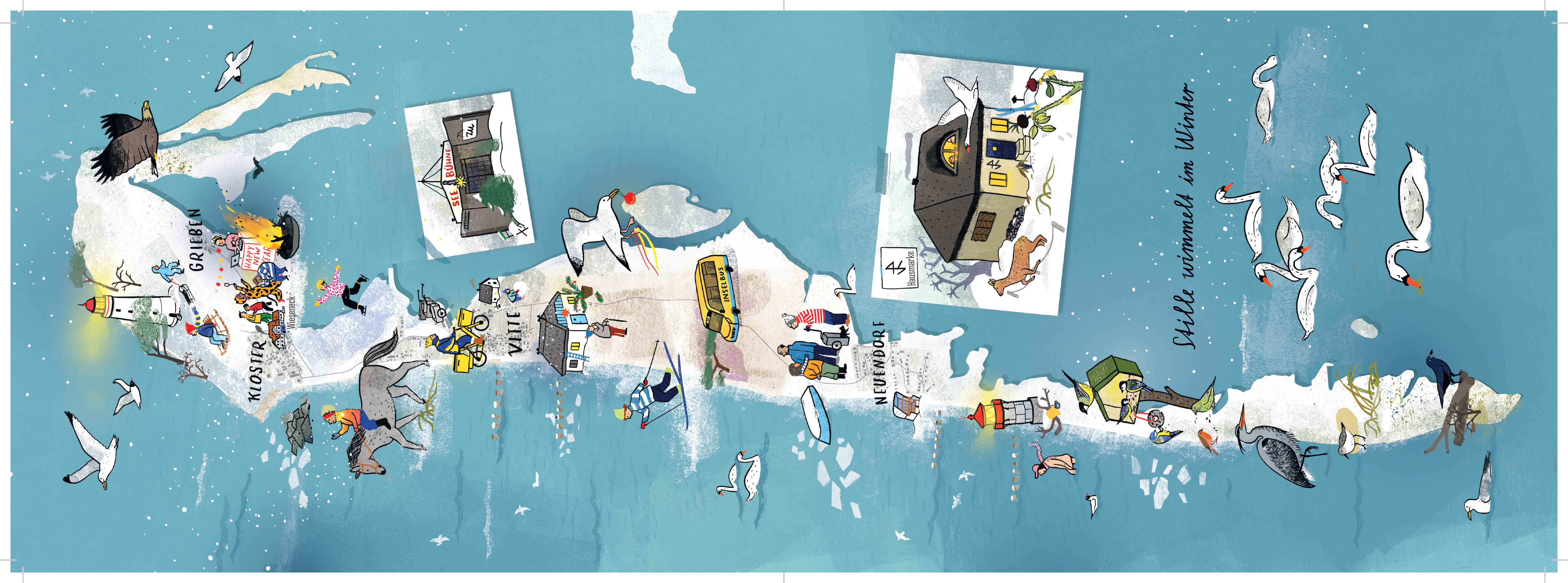 | Zusatzinfo | Auf insgesamt sieben Karten werden verschiedene Themen liebevoll und differenziert illustriert: • Tierlebendiges Hiddensee • Pflanzenlebendiges Hiddensee • Menschen wimmeln im Sommer • Stille wimmelt im Winter • Literaturliebe lebt auf Hiddensee • Hiddensee-Leben in der DDR • So könnte es auf Hiddensee auch sein |