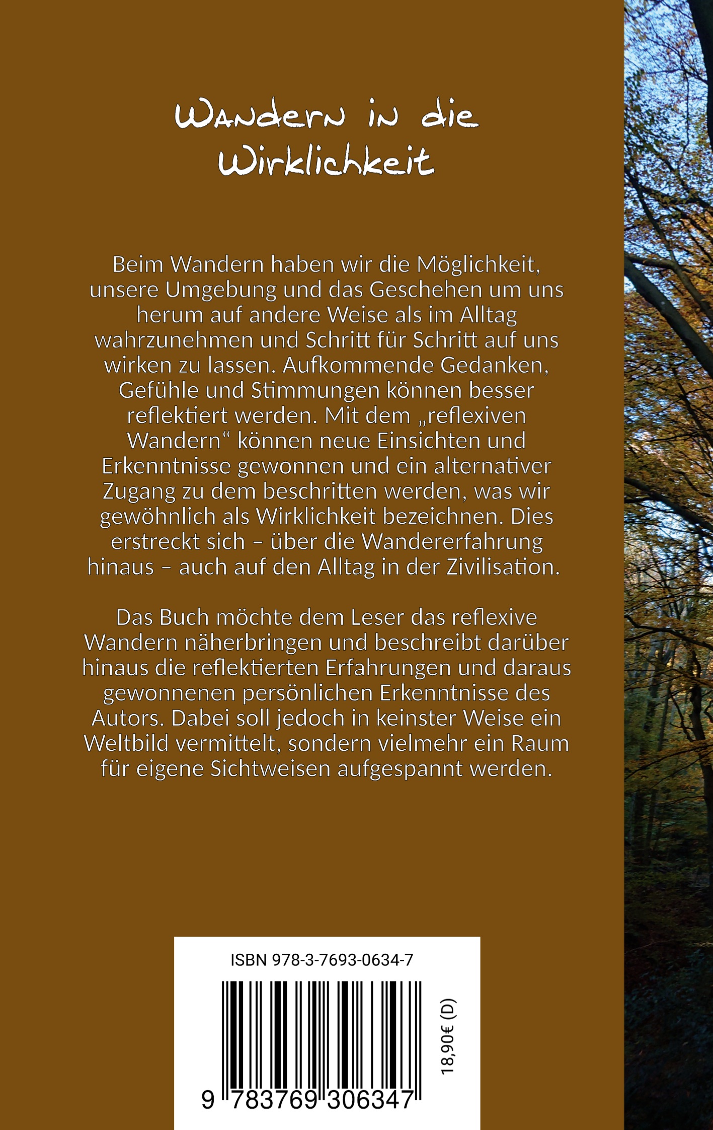 Beim Wandern haben wir die Möglichkeit, unsere Umgebung und das Geschehen um uns herum auf andere Weise als im Alltag wahrzunehmen und Schritt für Schritt auf uns wirken zu lassen. Aufkommende Gedanken, Gefühle und Stimmungen können besser reflektiert werden. Mit dem "reflexiven Wandern" können neue Einsichten und Erkenntnisse gewonnen und ein alternativer Zugang zu dem beschritten werden, was wir gewöhnlich als Wirklichkeit bezeichnen. Dies erstreckt sich - über die Wandererfahrung hinaus - auch auf den Alltag in der Zivilisation.