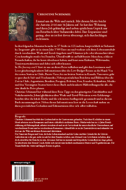 In ‚The Journey and I‘ lässt sie uns an dieser Reise teilhaben und gibt den Leserinnen und Leser gleichzeitig konkrete Informationen über das Low-Budget-Reisen an die Hand. Von der ersten Station in Chile, Puerto Varas, bis zur letzten Station in Kanada, Vancouver, geht es quer durch Süd- und Nordamerika.