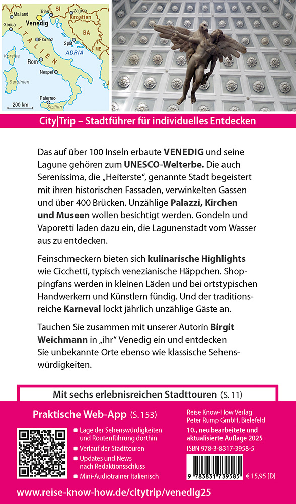 Dazu: kostenlose Web-App für Smartphone, Tablet und PC mit Stadtplan- und Satellitenansichten passend zum Text, Routenführung zu allen beschriebenen Sehenswürdigkeiten, Verlauf der Stadttouren, seitenbezogenen Updates nach Redaktionsschluss sowie einem Mini-Audiotrainer Italienisch
