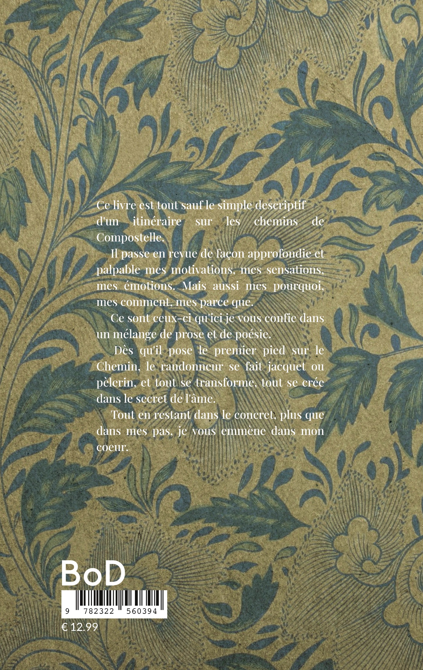 J'écris des poèmes depuis plus de 50 ans, sans jamais en avoir publié. Rentré du Chemin de Compostelle, j'eus envie de coucher sur le papier quelques pages de souvenirs et d'émotions. Juste pour mon plaisir. Mais les pages s'enchaînaient car mon âme débordait. C'est là que j'eu l'idée de les publier.