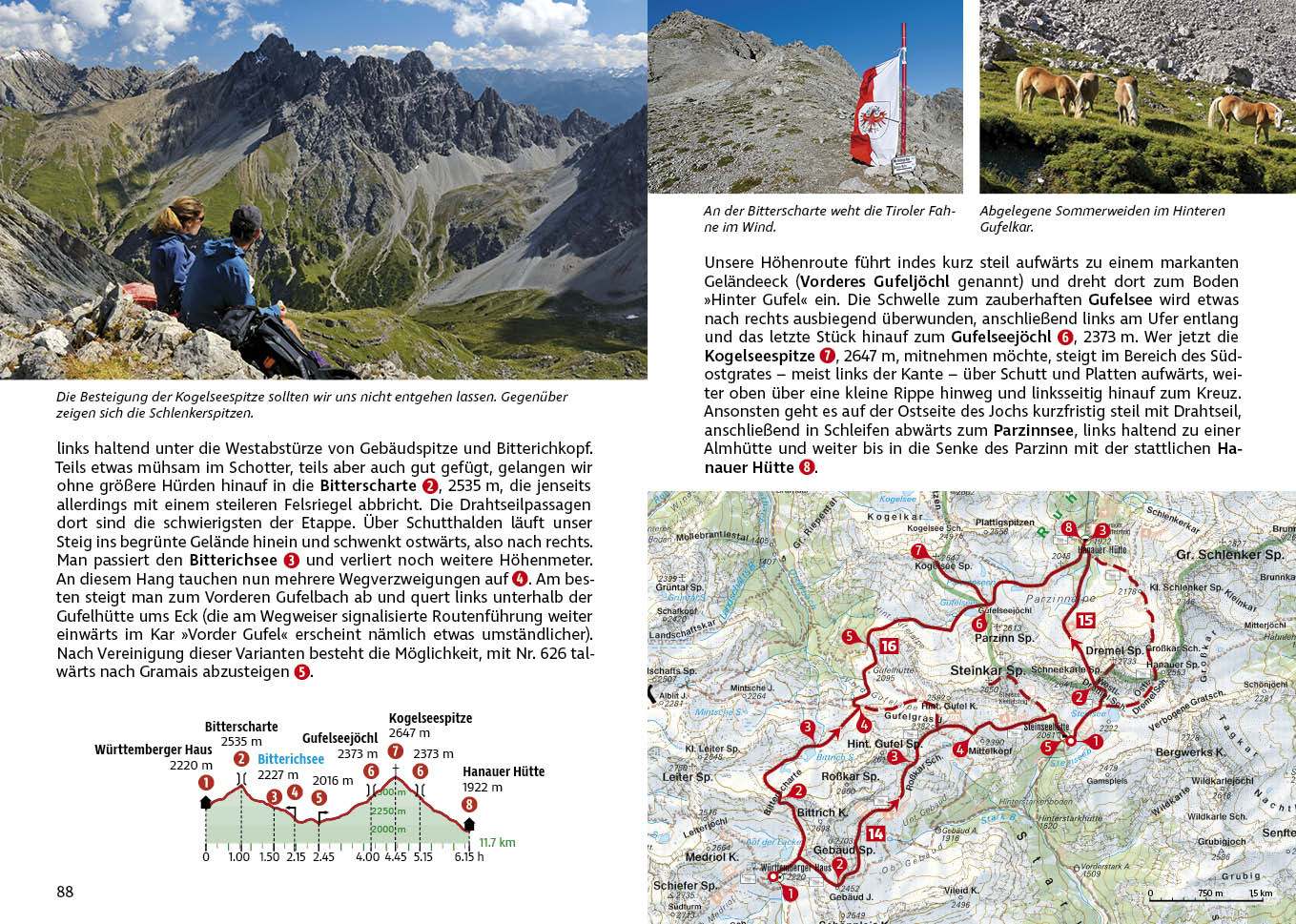 - Zuverlässige Etappenbeschreibungen: Präzise Infos zu Wegen, Hütten, Gehzeiten und Höhenmetern für eine optimale Tourenplanung