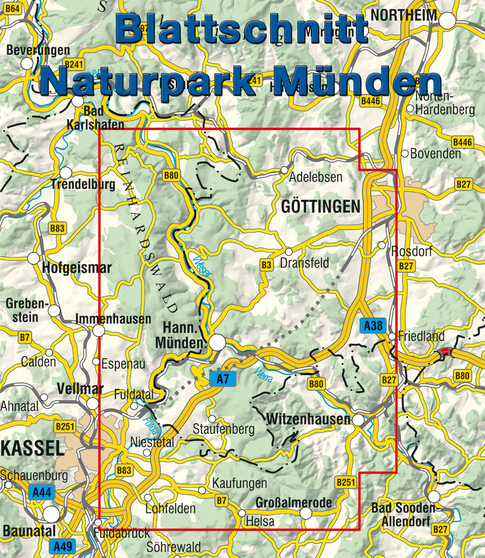 Der ca. 374 km² große und waldreiche Naturpark Münden liegt westlich von Göttingen und nördlich-östlich von Kassel und grenzt im Südosten an den Geo-Naturpark Frau-Holle-Land.Der Naturpark Münden zählt zu den ältesten in Deutschland und wird geprägt von einem vielfältigen Mix aus bewaldeten Bergen und Bächen, mit Ihren Waldwiesentälern, die in Werra, Fulda oder Weser münden. Mit etwas Glück kann man hier die Gebirgsstelze, den Eisvogel oder den Schwarzstorch beobachten.Auf den kalkigen Böden der Waldgebiete lässt sich im Frühjahr eine große Pracht an Frühjahrsblühern bestaunen und im Herbst haben Pilze hier gute Wachstumsbedingungen. Größte Stadt der Region ist Hann. Münden, am Zusammenfluss von Fulda und Werra zur Weser gelegen.Die neue, 5. Ausgabe der Rad- und Wanderkarte Naturpark Münden stellt im übersichtlichen Maßstab 1:35 000 den gesamten Naturpark Münden mit dem vollständigen Rad- und Wanderwegenetz dar und stellt die Verbindung zwischen der Rad- und Wanderkarte Geo-Naturpark Frau-Holle-Land und der Karte Reinhardswald her.Ein integriertes UTM-Gitter ermöglicht die Orientierung im Gelände mit Hilfe eines GPS- Gerätes und eine Geländeschummerung visualisiert das Mittelgebirge.