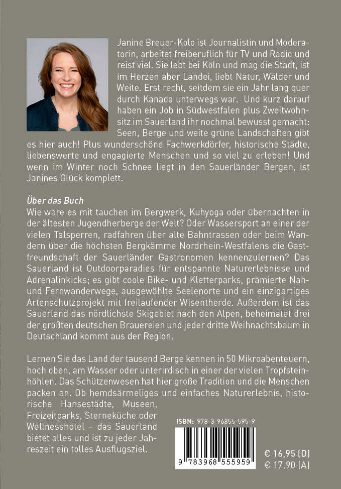 Janine Breuer-Kolo ist Journalistin und Moderatorin, arbeitet freiberuflich für TV und Radio und reist viel. Sie lebt in Köln und mag die Stadt, ist im Herzen aber Landei, liebt Natur, Wälder und Weite. Erst recht, seit sie ein Jahr quer durch Kanada unterwegs war. Und seit sie in Südwestfalen arbeitet und im Sauerland einen Zweitwohnsitz hat, weiß sie: Seen, Berge und weite grüne Landschaften gibt es hier auch! Plus wunderschöne Fachwerkdörfer, historische Städte, liebenswerte und engagierte Menschen und so viel zu erleben! Und wenn im Winter noch Schnee liegt in den Sauerländer Bergen, ist Janines Glück komplett.