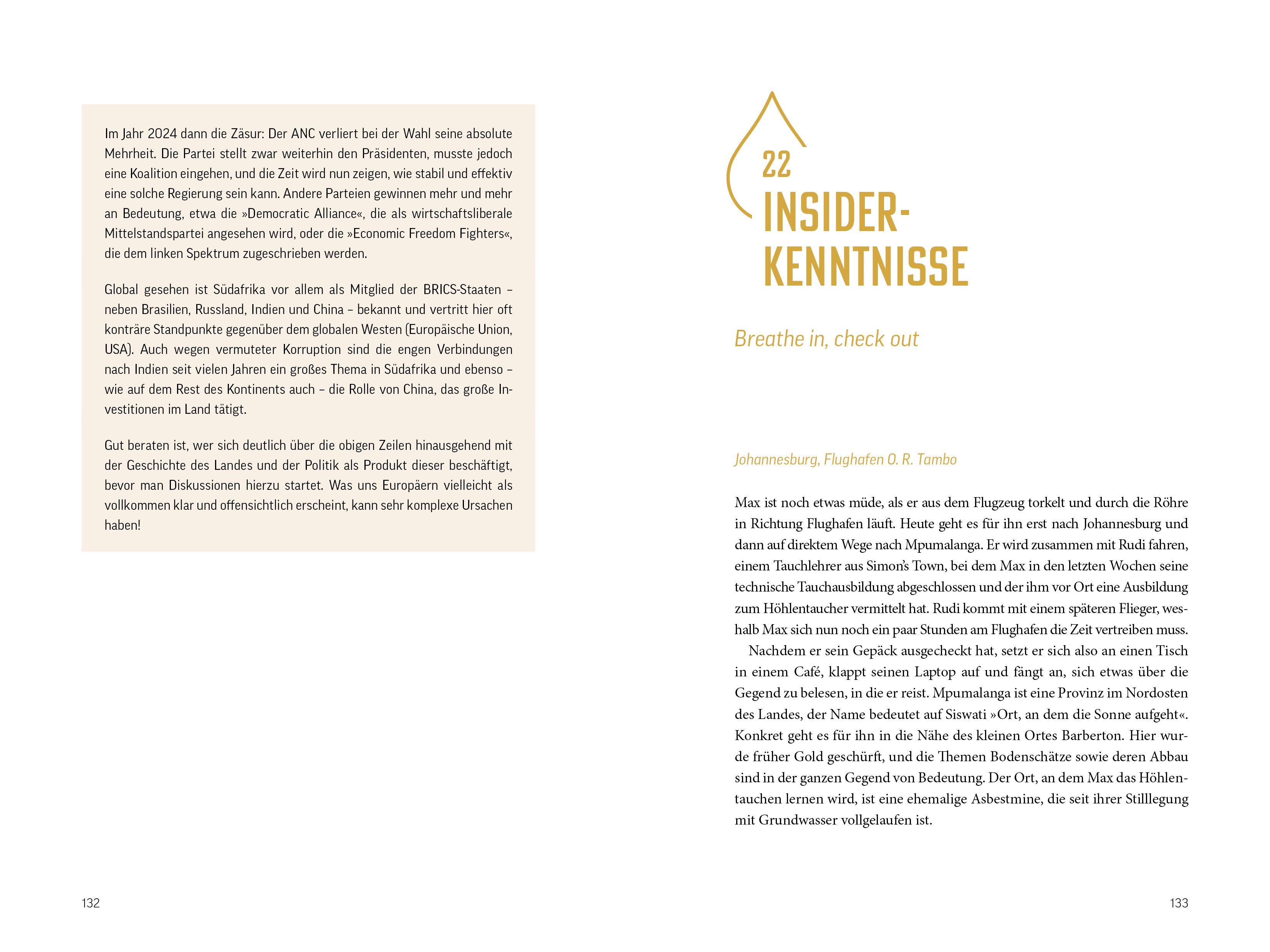In Südafrika erwarten einen viele Überraschungen und Missverständnisse. Von der Frage nach der Sprache bis zu unerklärlichen Blicken der Polizisten – jedes Fettnäpfchen birgt eine neue Entdeckung. Der abenteuerliche Trip führt durch Kapstadt, die Karoo und Johannesburg und lässt einen die vielfältigen Kulturen und Eigenheiten des Landes auf humorvolle Weise erleben.