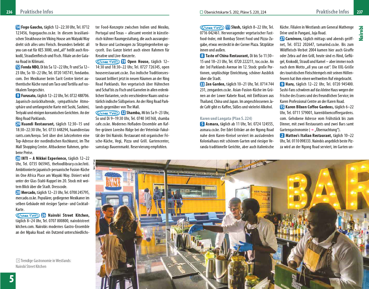 Die beiden Startpunkte für das kenianische Abenteuer werden praktisch immer Nairobi oder Mombasa sein - beide Millionenstädte kann man aus dem deutschen Sprachraum problemlos anfliegen. Wie man von dort aus das Beste macht aus dem afrikanischen Urlaub, das wird auf rund 600 Seiten und mit praktischen Tourenvorschlägen detailliert vorgestellt. Selbst wer sich für eine ausgedehnte Safari durch das Landesinnere oder ausschließlich ein Strandvergnügen unter Palmen interessiert, wird keinen wichtigen Tipp vermissen. Auch das alltägliche Kenia am Wegesrand kommt natürlich nicht zu kurz, und eine politische Landeskunde wird mitgeliefert.