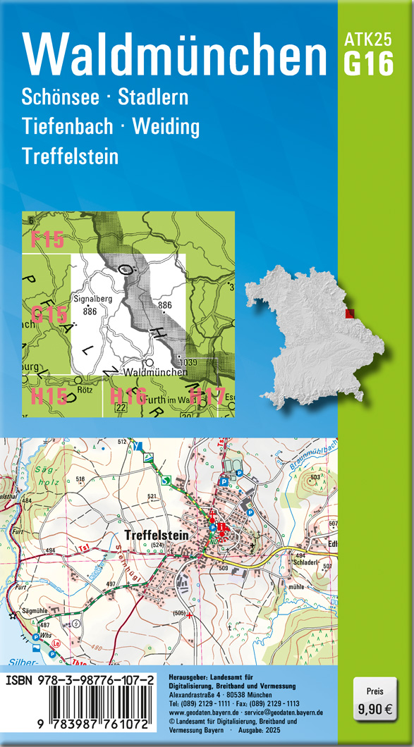 Wer es genau wissen will, greift zur ATK25. Diese Kartenserie im Maßstab 1:25000 bildet mit ihrer detaillierten Darstellung das komplette Verkehrsnetz mit allen Straßen und Wegen ab.237 Einzelblätter stellen Bayern flächendeckend dar. Ein Kartenblatt umfasst ca. 21 km x 22 km.Was bietet die ATK25?- individuelle Freizeitgestaltung mit allen ausgeschilderten Wander- und Radwanderwegen- sichere Orientierung auch abseits der markierten Routen- umfangreiches Spektrum an Freizeiteinrichtungen und Sehenswürdigkeiten- anschauliche Wiedergabe der GeländeformenKartenblatt ATK25-G16 Waldmünchen:REGION: Oberpfalz, Oberpfälzer Wald, BöhmerwaldORTE: Waldmünchen, Schönsee, Stadlern, Tiefenbach, Weiding, Treffelstein