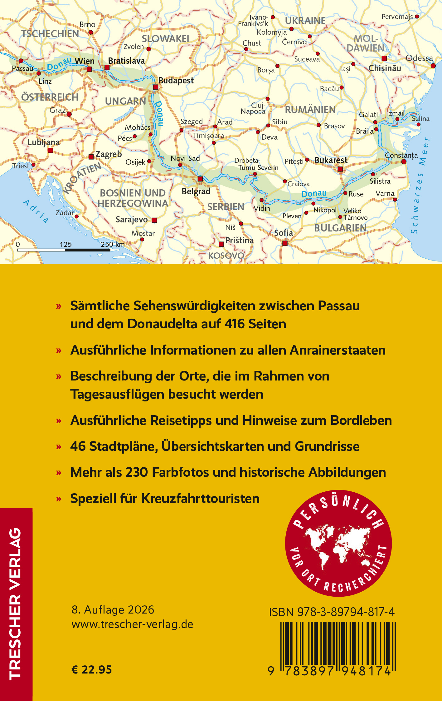 In Kapiteln zur Historie des Kulturraums und zur Schifffahrt auf dem Strom führt der Trescher-Reiseführer KREUZFAHRTEN DONAU in die bewegte Vergangenheit ein. Informationen zur Geschichte und aktuellen Situation der Anrainerstaaten vervollständigen die Darstellung. Zahlreiche Stadtpläne und Übersichtskarten erleichtern die Orientierung unterwegs, im Anhang finden sich ausführliche Reisetipps und weiterführende Literaturempfehlungen. Das Buch eignet sich ideal zur Reisevorbereitung und bietet für alle Orte ausführliche Beschreibungen ihrer Sehenswürdigkeiten.
