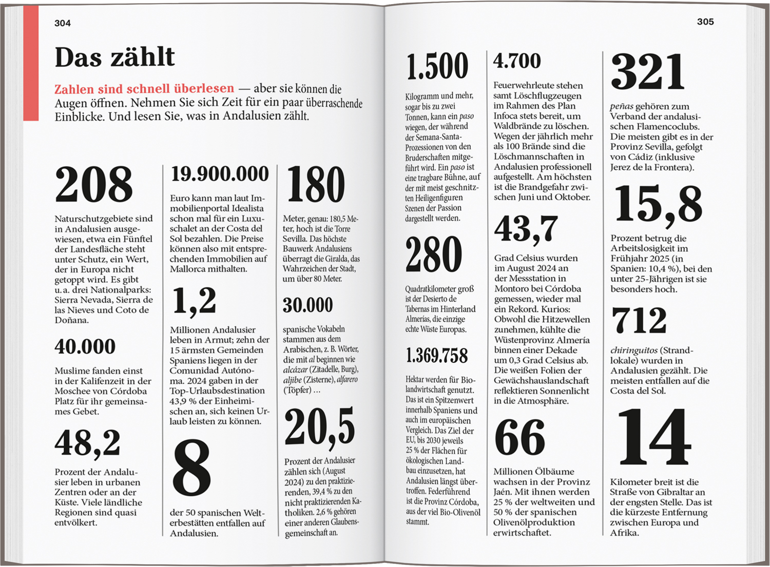 Senkrechtstarter, Überflieger, Querfeldein. Vor Ort - die Kapitel: Málaga, Costa del Sol und Hinterland, Die Atlantikküste, Sevilla und Umgebung, Der Nordosten - Córdoba und Jaén, Der Südosten - Granada und Almería. Das Kleingedruckte (Reiseinfos von A bis Z). Das Magazin. Offene Fragen.
