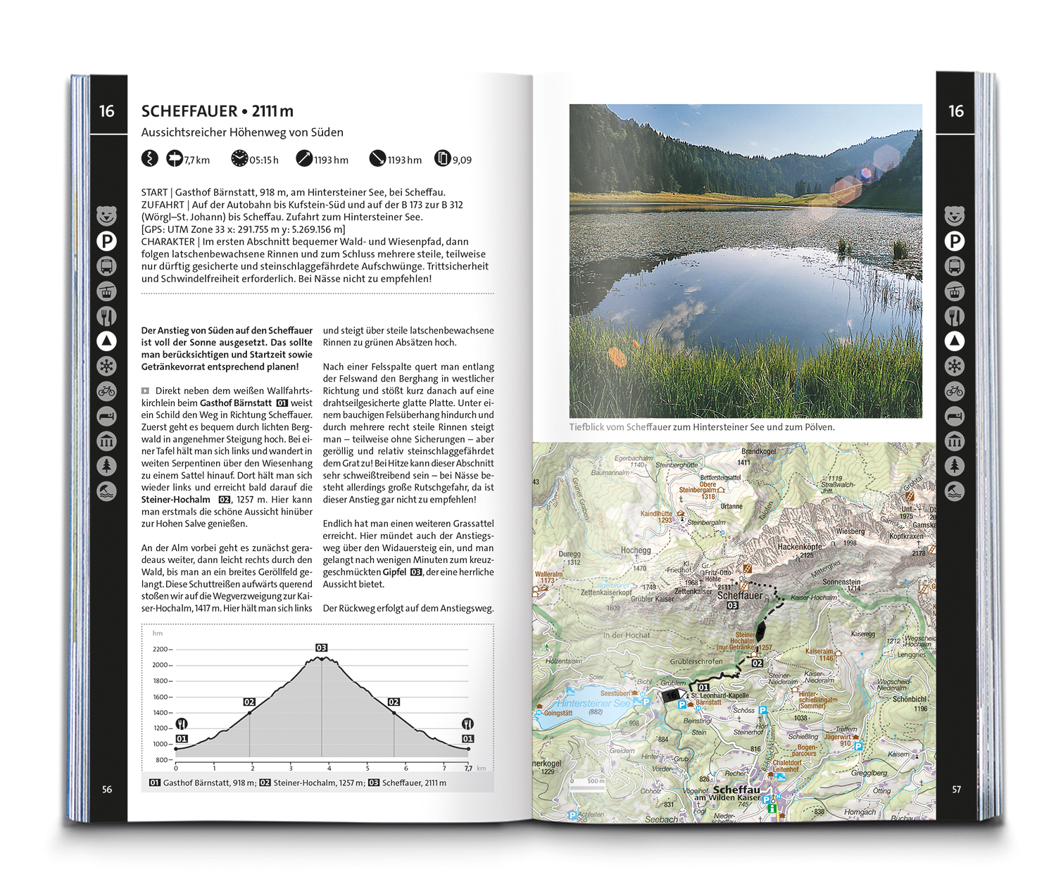 Das Buch enthält exakte Wegbeschreibungen und detaillierte Karten mit dem eingezeichneten Verlauf zu jeder Wanderung. Dabei ist auf einen Blick erkennbar, ob es sich beim Untergrund vorwiegend um einen normalen Weg, einen schmaleren Pfad oder um einen unbefestigten Steig handelt. Start- und Zielpunkte sowie wichtige Wegpunkte sind deutlich markiert und erleichtern die Orientierung. Mit dabei sind die GPX-Daten zum Download. Angaben zur Schwierigkeit, Gehzeit, zu den Höhenmetern und Gesamtkilometern sowie zum Charakter der Touren sind übersichtlich und schnell erfassbar präsentiert. Zusätzliche Hinweise zu Einkehr- oder Bademöglichkeiten, Sehenswürdigkeiten, etc. und ob die Tour für Kinder geeignet ist machen die Auswahl und Planung der nächsten Wanderung spielend einfach.