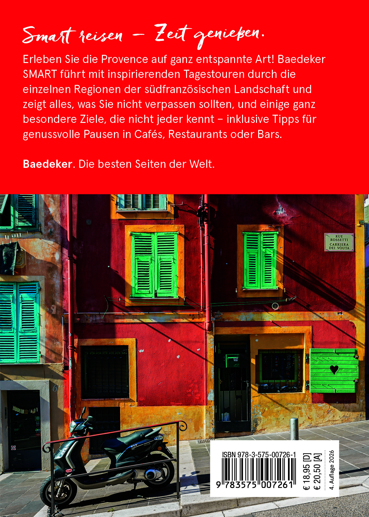 Rund 3.000 Sonnenstunden pro Jahr, ein leuchtender Blütenteppich von Lavendel und heilige Berglandschaften - entdecken Sie bei Ihrem Frankreich-Urlaub die einzigartige Region Provence. Erleben Sie die großartigen Landschaften vom Mont Ventoux bis zur Camargue, atmosphärische Städte wie Aix-en-Provence und Arles und wagen Sie einen Ausflug zu dem großartigen römischen Bauwerk Pont du Gard. Wir zeigen Ihnen herrliche Küstenstraßen von Marseille über Saint Tropez und Monaco bis nach Nizza, bringen Sie ins wilde Hinterland Frankreichs zu der atemberaubenden Gorges du Verdon und begleiten Sie in traditionsreiche Dörfer. Mit dem Baedeker SMART haben Sie den perfekten Reiseführer an Ihrer Seite, der Sie das Außergewöhnliche auf Ihrer Provence-Rundreise entdecken lässt.