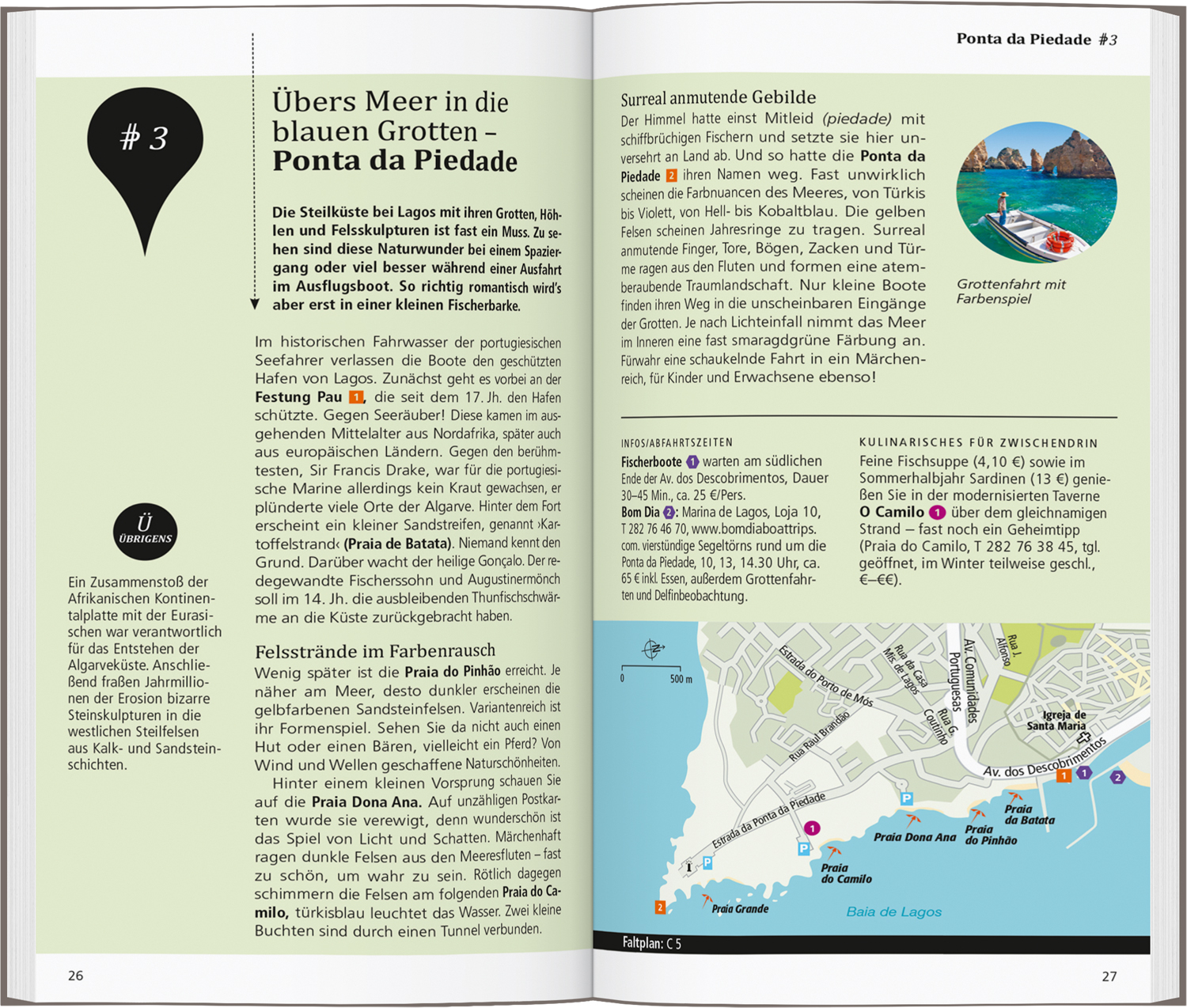 Dank vieler Tipps und Adressen erfahren Sie, wo es sich in fremden Betten gut schläft, wo Sie glücklich satt werden, wohin die Portugiesen zum Stöbern und Entdecken gehen und wohin es sie zieht, wenn die Nacht beginnt. Mit den Übersichtskarten, genauen Stadtplänen und dem separaten großen Faltplan können Sie sich nach Lust und Laune durch die Algarve treiben lassen.