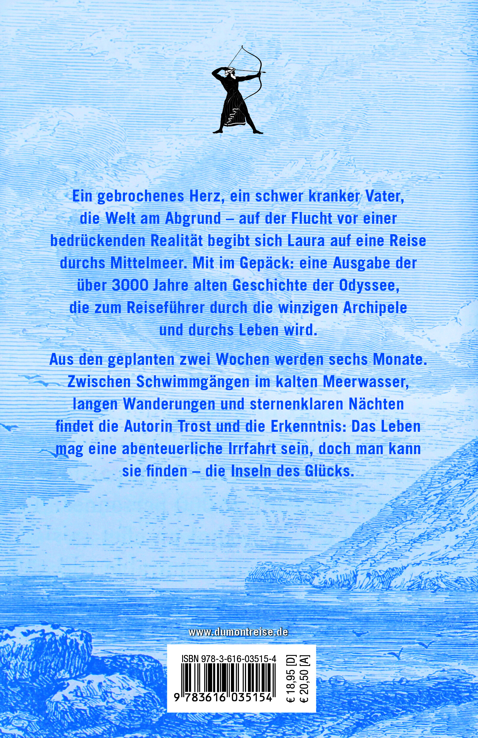 DER KERL HAT EINFACH SCHLUSS GEMACHT ... Ein gebrochenes Herz, ein schwer kranker Vater, die Welt am Abgrund - auf der Flucht vor einer bedrückenden Realität begibt sich Laura auf eine Reise durchs Mittelmeer. Mit im Gepäck: eine Ausgabe der über 3000 Jahre alten Geschichte der Odyssee, die zum Reiseführer durch die winzigen Archipele und mystischen Inselwelten wie auch durchs Leben wird. Aus den geplanten zwei Wochen werden sechs Monate. Laura entdeckt die wilde Schönheit der Inseln und die erlösende Kraft des Reisens. Zwischen Schwimmgängen im kalten Meerwasser, langen Wanderungen und sternenklaren Nächten findet sie Trost und die Erkenntnis: Das Leben mag eine abenteuerliche Irrfahrt sein, voller Schiffbrüche und Ungeheuer. Doch man kann sie finden - die Inseln des Glücks.