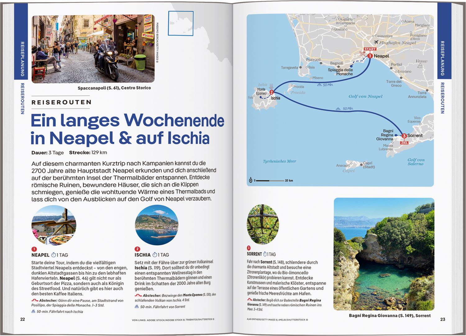 Kampanien ist das Italien unserer Träume - sonnenverwöhnte, glamouröse Küsten und Tomatensoße rührende Nonnas. Im einen Moment vertraut, im anderen überraschend. Entdecke die besten Erlebnisse und bestgehüteten Geheimnisse von Neapel, Pompeji und der Amalfiküste, vom Glasbodenboot zu den versunkenen Unterwasser-Ruinen der antiken römischen Stadt Aenaria, über ein entspanntes Picknick im idyllischen Weinberg Vigne di Raito, bis hin zum Besuch der zahlreichen bunten Boutiquen in Positano, die Souvenirs und Strandbekleidung verkaufen - Kampanien wartet darauf, von dir entdeckt zu werden!