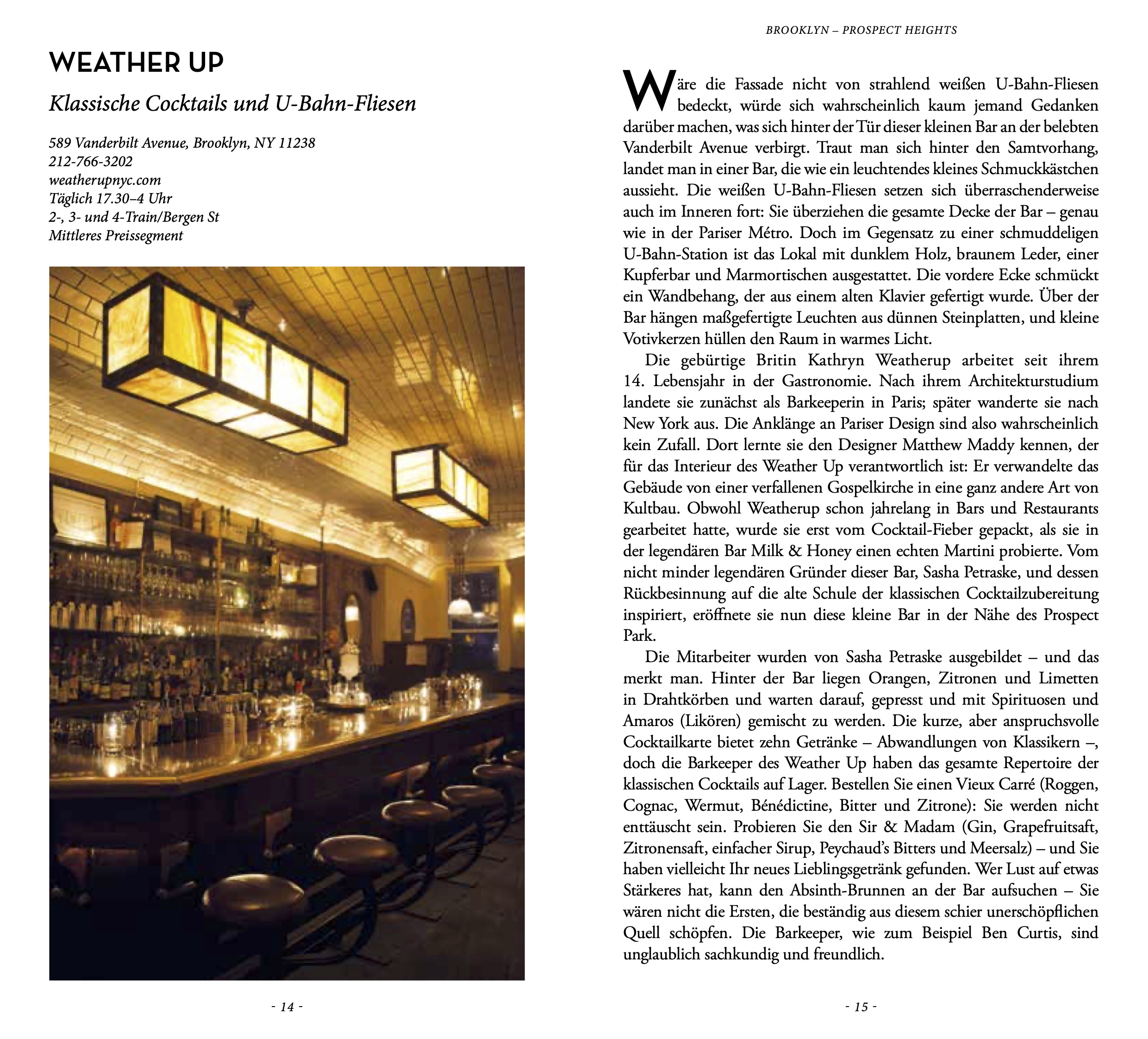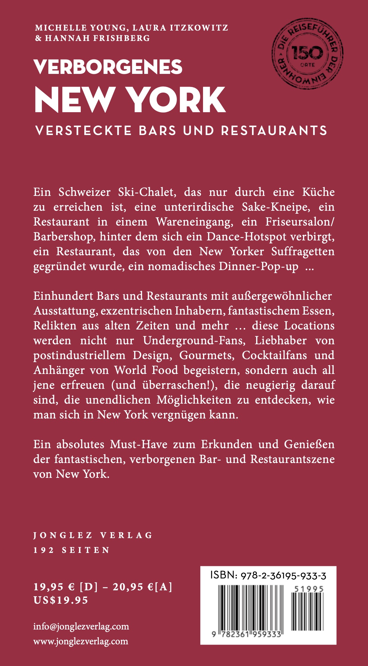 Ein Club im Hinterzimmer eines Dessous-Ladens, ein Hare-Krishna-Tempel mit Kantine, eine mexikanische Pulque-Bar ineinem Chinatown-Keller, ein zentralasiatisches Lokal über dem größten Diamantenviertel der Welt, Hole-in-the-Wallin Frachteingängen, ein Schweizer Ski-Chalet, ein öffentlich zugänglicher Speisesaal in denSpeisesaal in den Vereinten Nationen, ein bei Prominenten beliebter in einem Pfandhaus, ein Tanzlokal hinter einem Friseur...Über 100 Seiten mit erstaunlichem Dekor, exzentrischen Orten, skurrile Speisen, neue Lokale, alteingesessene Lokale und mehr, die Underground- und postindustrielle Designliebhaber, raffinierte Gourmets, Cocktailtrinker und alle, die neugierig sind, mehr über die unendlichen Möglichkeiten Spaß in New York City zu haben.