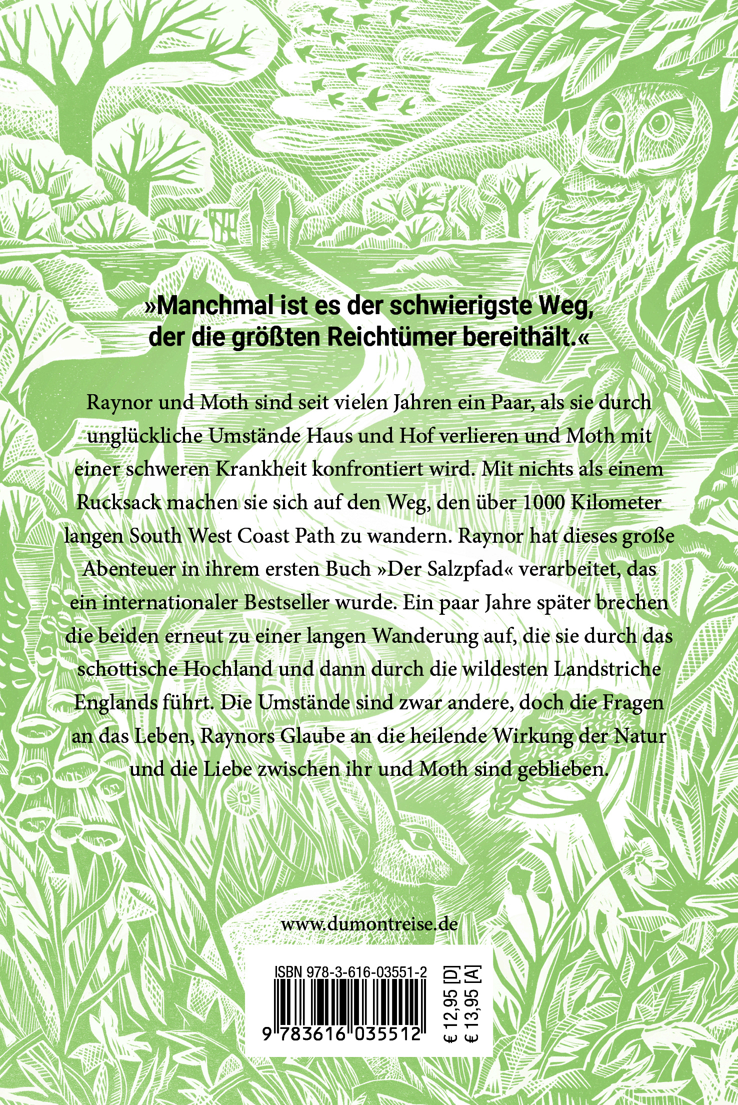 RAYNOR UND MOTH sind seit vielen Jahren ein Paar, als sie durch unglückliche Umstände Haus und Hof verlieren und Moth mit einer schweren Krankheit konfrontiert wird. Mit nichts als einem Rucksack machen sie sich auf den Weg, den über 1000 Kilometer langen South West Coast Path zu wandern. Raynor hat dieses große Abenteuer in ihrem ersten Buch "Der Salzpfad" verarbeitet, das ein internationaler Bestseller wurde. Ein paar Jahre später brechen die beiden erneut zu einer langen Wanderung auf, die sie durch das schottische Hochland und dann durch die wildesten Landstriche Englands führt. Die Umstände sind zwar andere, doch die Fragen an das Leben, Raynors Glaube an die heilende Wirkung der Natur und die Liebe zwischen ihr und Moth sind geblieben.