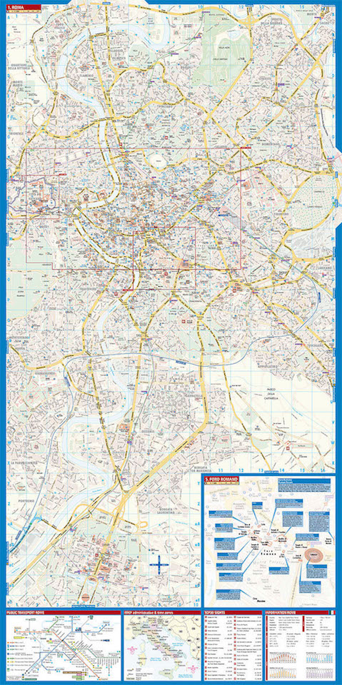 Unsere folienbeschichtete und gefaltete Borch Map von Rom in der 15. Auflage beinhaltet: Rom 1:15 000, Rom Zentrum 1:11 000, Vatikan 1:7 000, Rom & Umgebung 1:250 000, Forum Romanum 1:7 000, das öffentliche Verkehrsnetz und eine administrative Übersichtskarte von Italien. Borch Maps beinhalten eine Vielzahl interessanter und nützlicher Informationen wie Top Sights, Museen, Monumente, Märkte und viele weitere Sehenswürdigkeiten, aber auch Statistiken, Umrechnungstabellen, Klimadiagramme und viele detailreiche Übersichtskarten, die eine Borch Map zu einem exzellenten Reisebegleiter machen. Kartenformat (offen): 990 x 494 mm.