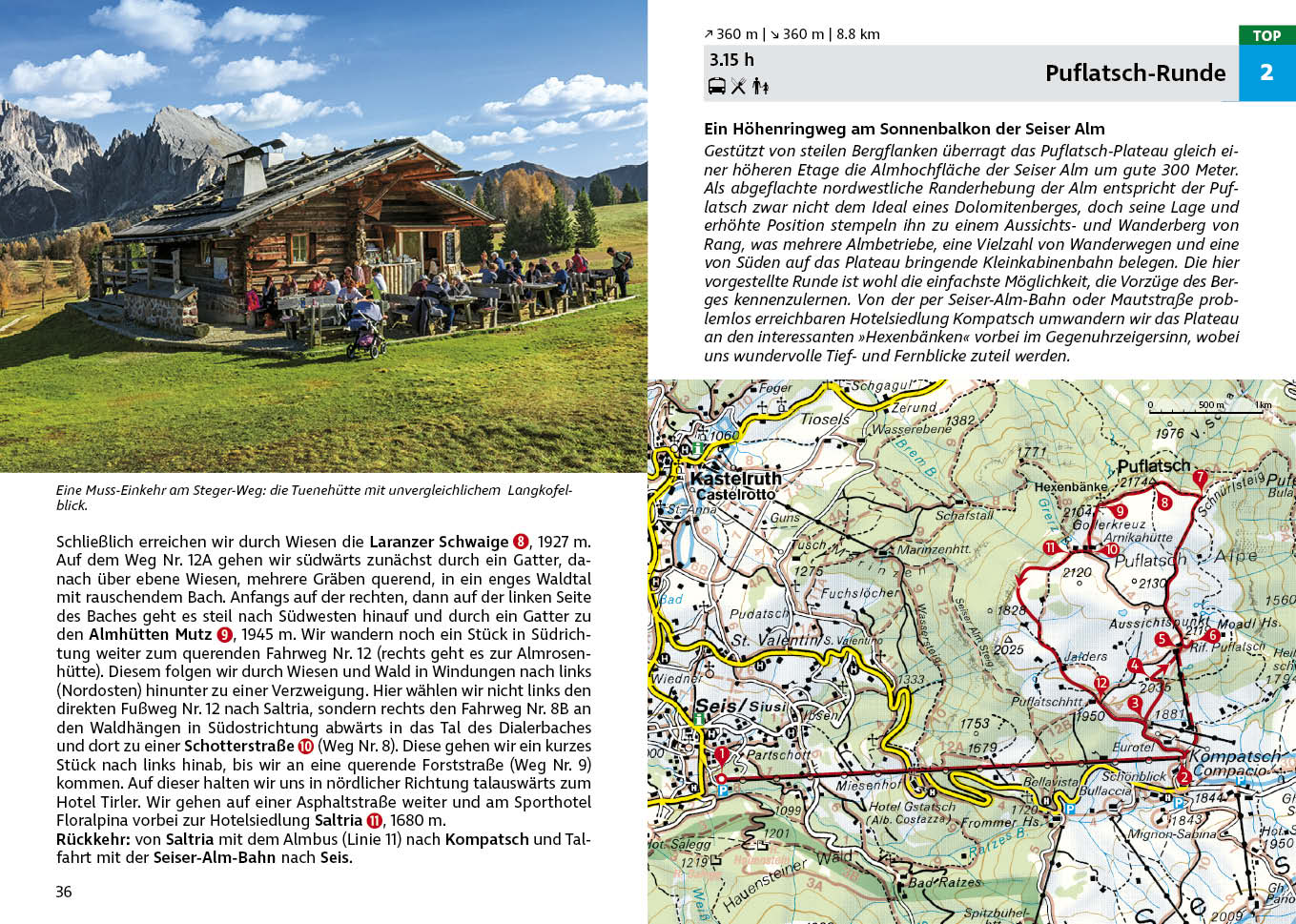 Mit höchst abwechslungsreichen und leichten Wanderungen führt der Wanderführer über die Seiser Alm. So geht es auf bequemen Wanderwegen auf das aussichtsreiche Plateau Puflatsch. Einfach herrlich ist die Umrundung der berühmten Dolomitenberge Langkofel und Schlern, die von allen Seiten großartige Fotomotive sind. Gepflegte Wege und Sessellifte machen den Naturgenuss auf der Seiser Alm generell leicht. Idyllisch verstreut liegen Hütten, Almen und Gasthöfe, die wunderbare Wanderziele mit feiner Einkehr und Panoramablick sind. Dass die Seiser Alm autofrei ist, macht den Landschaftsgenuss umso größer. Nur über eine Mautstraße, zwei Seilbahnen aus St. Ulrich im Grödnertal und aus Seis sowie einem Bus ist das Gebiet erreichbar.