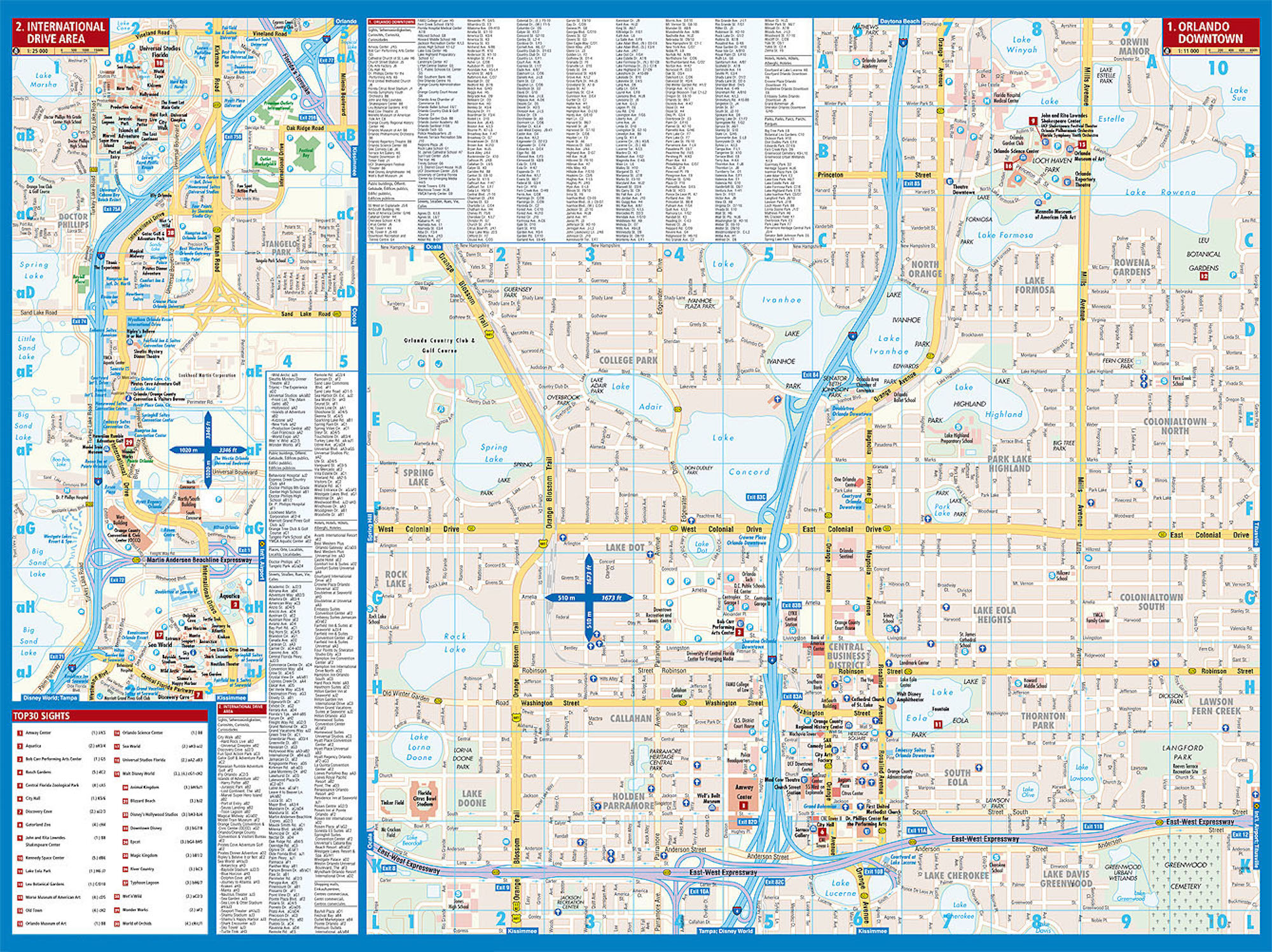 Unsere folienbeschichtete, gefaltete Karte von Orlando. Diese Auflage beinhaltet: Orlando Zentrum 1:11 000, Floridas Zentrum 1:1 200 000, Orlando&Umgebung 1:200 000, Walt Disney World 1:25 000, International Drive Area 1:25 000, Top 30 Sehenswürdigkeiten, eine administrative Übersichtskarte der USA mit den Zeitzonen. Borch Maps sind leicht zu falten, langlebig und wasserabweisend mit einer beschriftbaren Oberfläche. Borch Maps zeigen Hotels, Museen, Monumente, Märkte, Linien des öffentlichen Verkehrsnetzes, Sehenswürdigkeiten, nützliche Statistiken, Umrechnungstabellen für Temperaturen, Maße und Gewichte, Klimadiagramme mit Temperaturen, Sonnenscheindauer, Niederschlag und Luftfeuchtigkeit, Übersichtskarten, Zeitzonen und vieles mehr... Einzelkarten: Orlando Downtown 1:11 000, Central Florida 1:1 200 000, Orlando & Region 1:200 000, Walt Disney World 1:25 000, International Drive Area 1:25 000, USA administrative & time zones