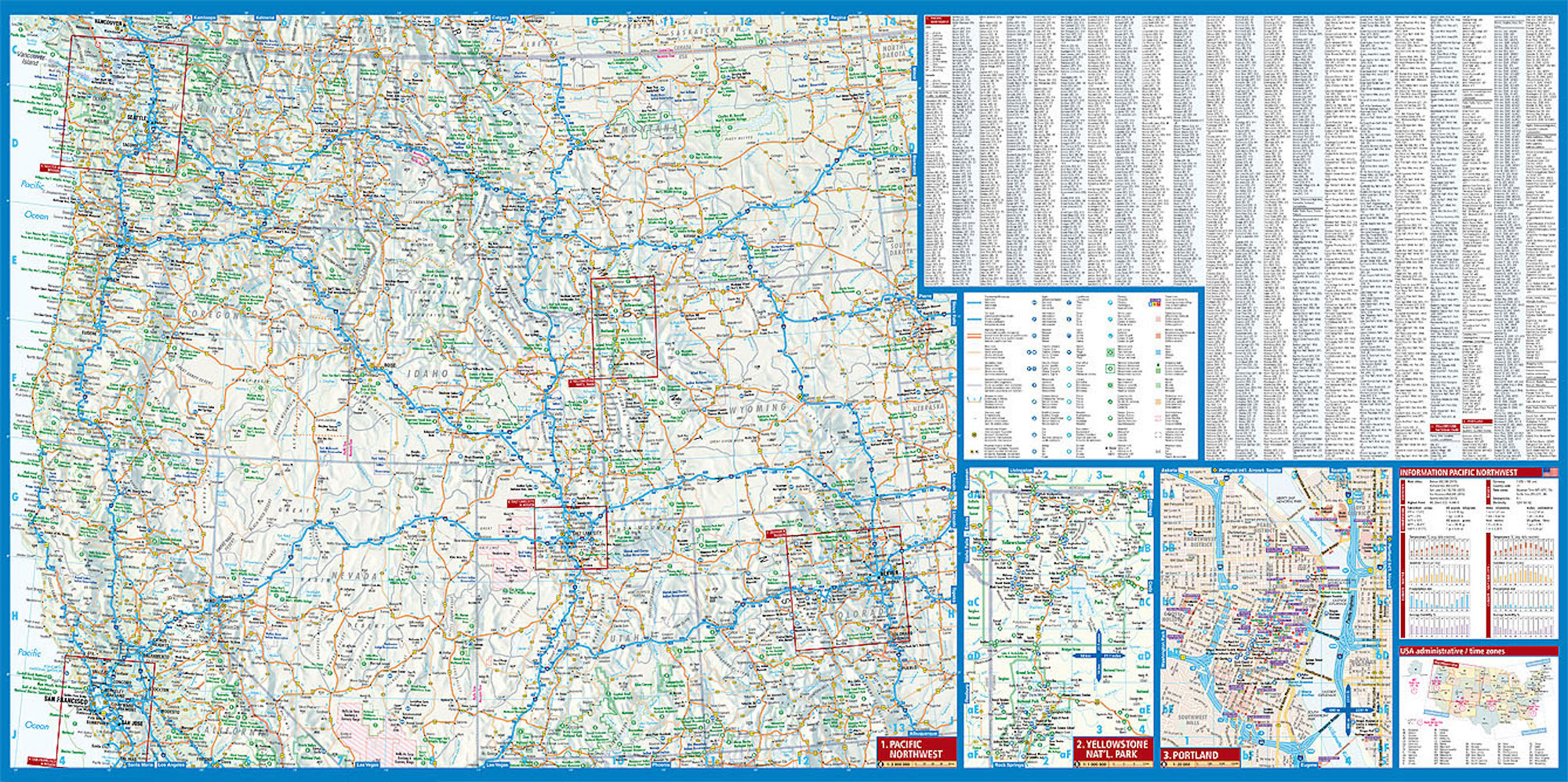 Unsere folienbeschichtete und gefaltete Borch Map von Amerikas Nordwesten, Northwest-USA, in der 18. Auflage beinhaltet: Den am Pazifik gelegenen nordwestlichen Teil der USA 1:3 000 000, San Francisco 1:15 000, San Francisco Bay 1:400 000, San Francisco und Umgebung 1:1 000 000, Seattle 1:13 000,Großraum Seattle 1:250 000, Seattle und Umgebung 1:1 000 000, Portland 1:20 000, Denver und Umgebung 1:1 000 000, Salt Lake City und Umgebung 1:1 000 000, den Yellowstone Nationalpark 1:1 000 000 und eine administrative Übersichtskarte der USA mit Zeitzonen. Borch Maps beinhalten eine Vielzahl interessanter und nützlicher Informationen, detailreiche und benutzerfreundliche Kartographie, aber auch Statistiken, Umrechnungstabellen, Klimadiagramme und zahlreiche Übersichtskarten, die eine Borch Map zu einem exzellenten Reisebegleiter machen. Kartenformat (offen): 990 x 494 mm.