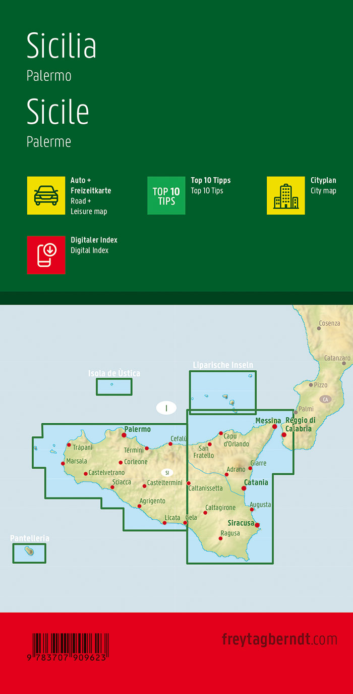 Neben der übersichtlichen Gestaltung bietet die Straßenkarte "Sizilien - Palermo" 1:150.000 zahlreiche Zusatzinformationen wie z.B. Straßenbeschaffenheit, Sehenswürdigkeiten, Campingplätze und Innenstadtpläne. Mit dem umfangreichen Ortsregister gelingt zudem eine rasche Orientierung.Die "Top 10 Tips" - Reihe bietet ein kleines Beiheft, in dem die zehn wichtigsten Sehenswürdigkeiten kurz beschrieben sind. (Sprachen: Italienisch, Deutsch, Englisch, Französisch, Niederländisch, Spanisch, Tschechisch, Slowakisch, Ungarisch, Polnisch);Details: Top 10 Tips Sehenswürdigkeiten, Citypläne von Palermo, Messina, Catania und Siracusa, Ortsregister mit Postleitzahlen.freytag & berndt Autokarten sind für viele Länder und Regionen weltweit erhältlich.