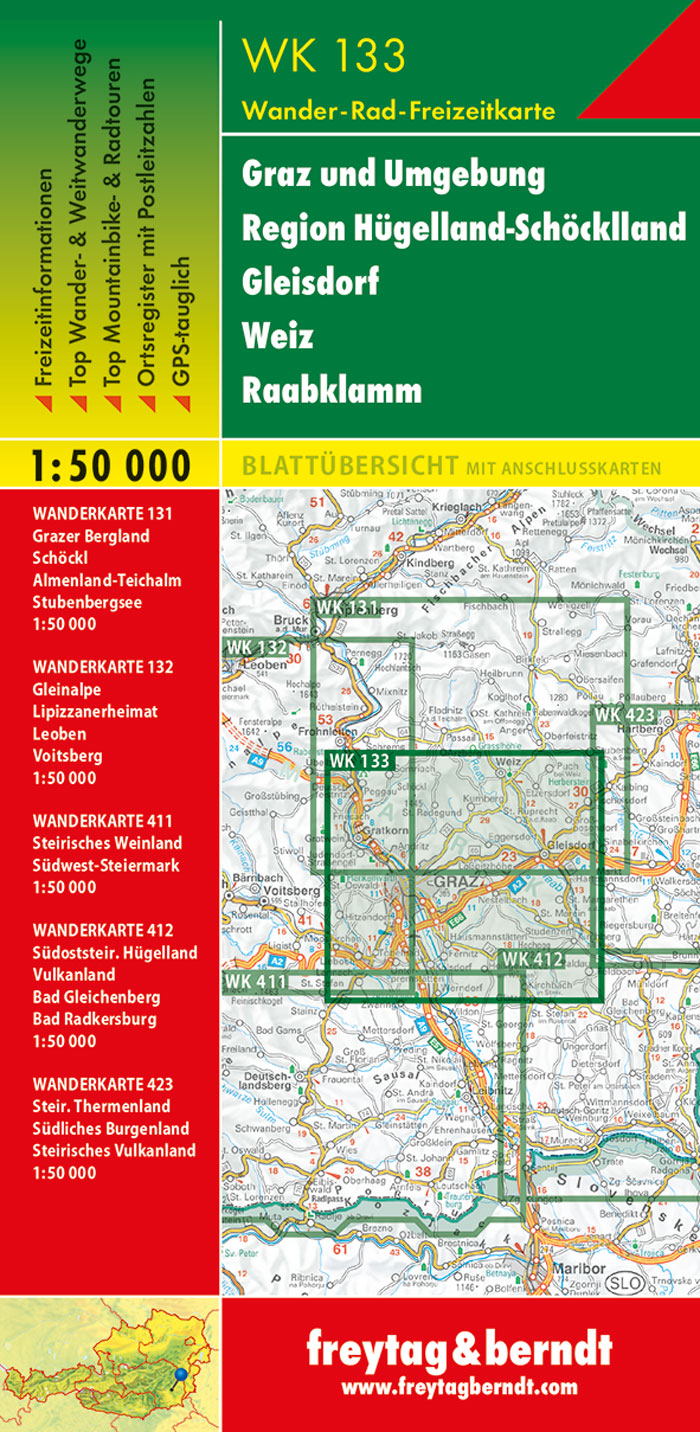 Die Wanderkarte "Graz und Umgebung - Region Hügelland-Schöcklland - Gleisdorf - Weiz - Raabklamm" wird regelmäßig überarbeitet und enthält aktualisierte Informationen zu Wanderwegen, Rad- und Mountainbikestrecken, Hütten, Naturdenkmälern, kulturellen Sehenswürdigkeiten und Freizeiteinrichtungen. Das beiliegende Informationsheft enthält eine Auswahl der besten Wanderwege, Radwege und Mountainbikestrecken sowie eine kurze Beschreibung der einzelnen Gemeinden mit ihrem Freizeitangebot. (Sprache: Deutsch) Freizeitinformationen, Wander- und Weitwanderwege, Mountainbike- und Radtouren, Ortsregister mit Postleitzahlen, GPS-tauglich, Klettersteig, Reitweg, Schiroute, Nordic-Walking-Strecke; Region: Graz, Graz Umgebung, Steiermark. Besondere Wander-Themenwege: Mariazellerweg, Jakobsweg, Via Slavorum, Pilgerweg, Grabenland Trail, Vulkanland Wanderweg, Grazer-Umland-Weg, GU-Süd Rundwanderweg, Wechselbergland Höhenweg. Spezielle Rad- und Mountainbiketouren: Mur-Radweg, Erzherzog-Johann-Radweg, Ilztal-Radweg, Raabtal-Radweg, Mostwärts-Radweg, Stiefingtal-Radweg, Panoramaweg GU3, Graz Umrundung. Umgebungskarten: WK 131, WK 132, WK 411, WK 412, WK 423. freytag & berndt Wanderkarten sind dank der detaillierten digitalen Kartographie und der genauen Maßstäbe ideale Begleiter beim Wandern, Bergsteigen und auf Skitouren.