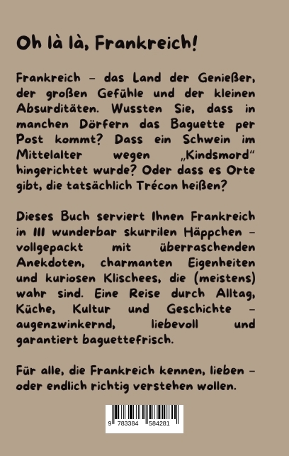 Oh là là, Frankreich!111 schräge und charmante Fakten über das Land der Liebe und der BaguettesFrankreich - das Land der Genießer, der großen Gefühle und der kleinen Absurditäten. Wussten Sie, dass in manchen Dörfern das Baguette per Post kommt? Dass ein Schwein im Mittelalter wegen "Kindsmord" hingerichtet wurde? Oder dass es Orte gibt, die tatsächlich Trécon heißen?Dieses Buch serviert Ihnen Frankreich in 111 wunderbar skurrilen Häppchen - vollgepackt mit überraschenden Anekdoten, charmanten Eigenheiten und kuriosen Klischees, die (meistens) wahr sind. Eine Reise durch Alltag, Küche, Kultur und Geschichte - augenzwinkernd, liebevoll und garantiert baguettefrisch.Für alle, die Frankreich kennen, lieben - oder endlich richtig verstehen wollen.Und wenn Ihnen dieses Buch gefällt, freut sich der Autor über eine 5-Sterne-Bewertung, wie ein Franzose über ein perfektes Croissant am Morgen.