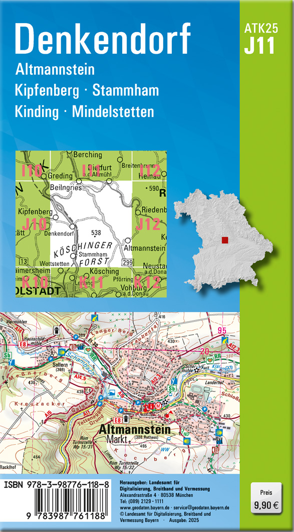 Wer es genau wissen will, greift zur ATK25. Diese Kartenserie im Maßstab 1:25000 bildet mit ihrer detaillierten Darstellung das komplette Verkehrsnetz mit allen Straßen und Wegen ab.237 Einzelblätter stellen Bayern flächendeckend dar. Ein Kartenblatt umfasst ca. 21 km x 22 km.Was bietet die ATK25?- individuelle Freizeitgestaltung mit allen ausgeschilderten Wander- und Radwanderwegen- sichere Orientierung auch abseits der markierten Routen- umfangreiches Spektrum an Freizeiteinrichtungen und Sehenswürdigkeiten- anschauliche Wiedergabe der GeländeformenKartenblatt ATK25-J11 Denkendorf:REGION: Oberbayern, Niederbayern, Oberpfalz, Fränkische Alb, Köschinger ForstORTE: Denkendorf, Altmannstein, Kipfenberg, Stammham, Kinding, Mindelstetten, Beilngries, Dietfurt a.d.Altmühl, Oberdolling